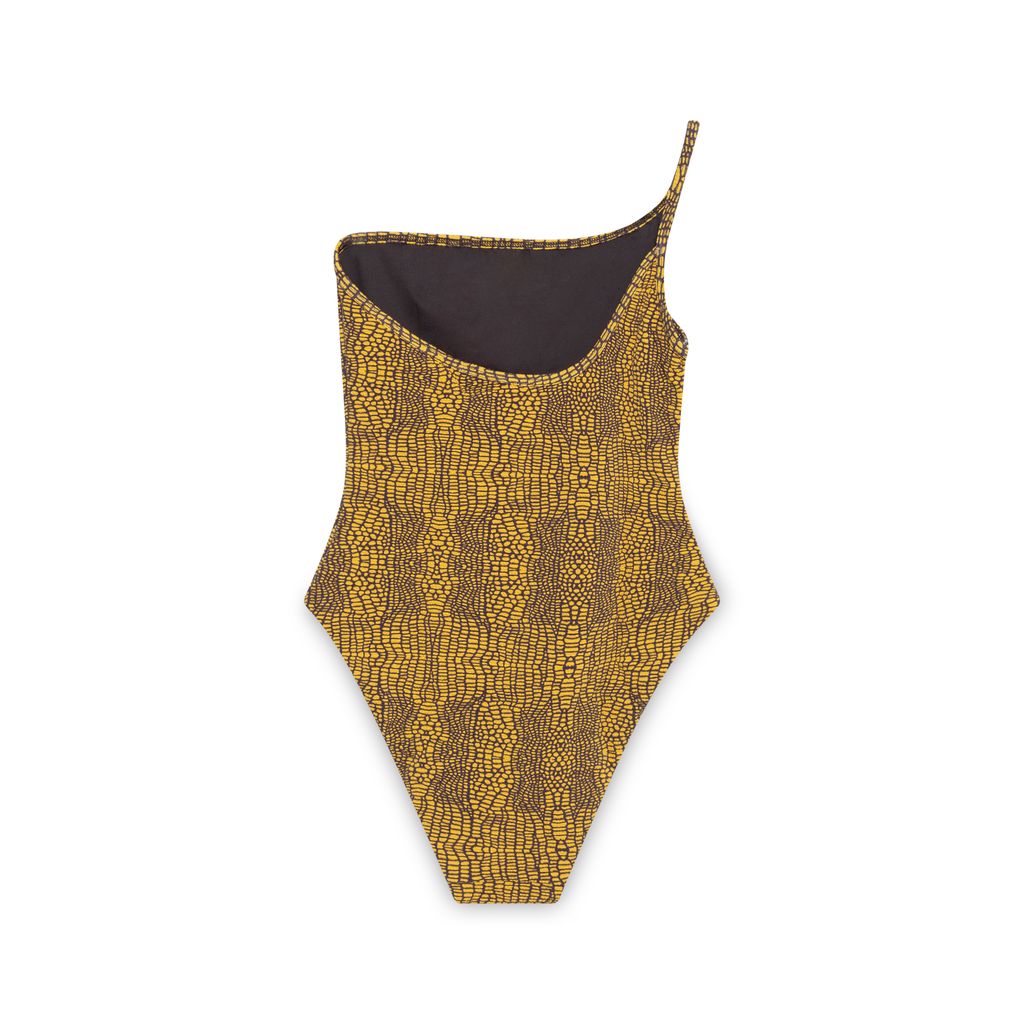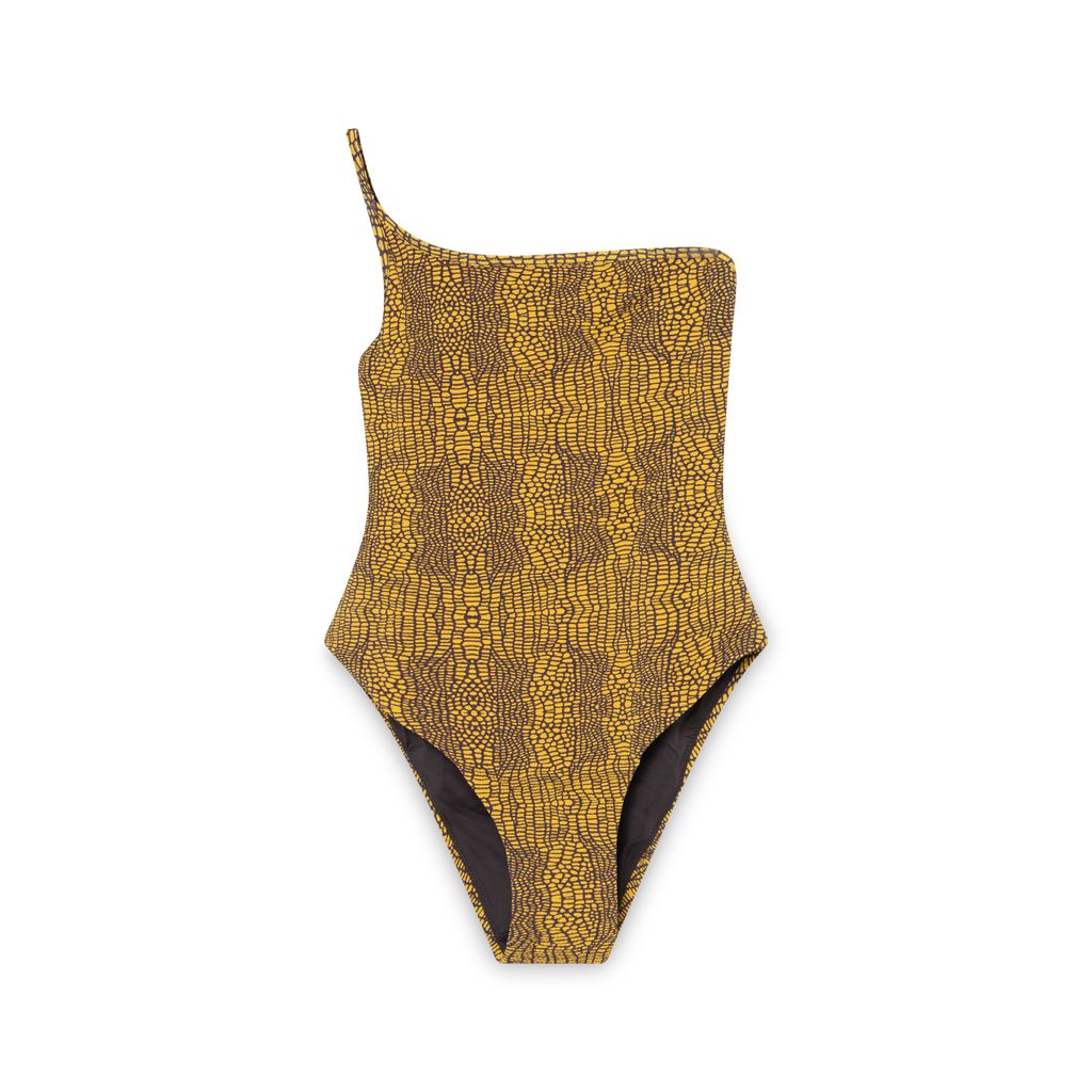 Laya Swim Goodbye Stranger swimsuit features pattern throughout, and asymmetrical one shoulder with medium width strap.