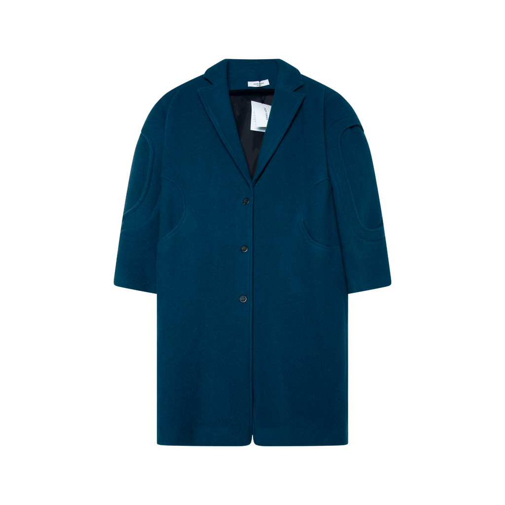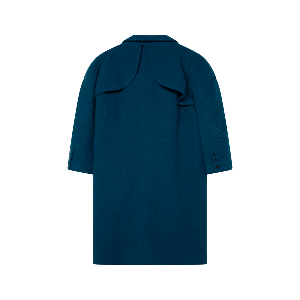 Layered Wool Trench in Teal features cut outs throughout with layered and paneled construction, notched lapel collar, button closure at front, welt pocket at interior, 3 button surgeon's cuffs, and welt pockets at waist.