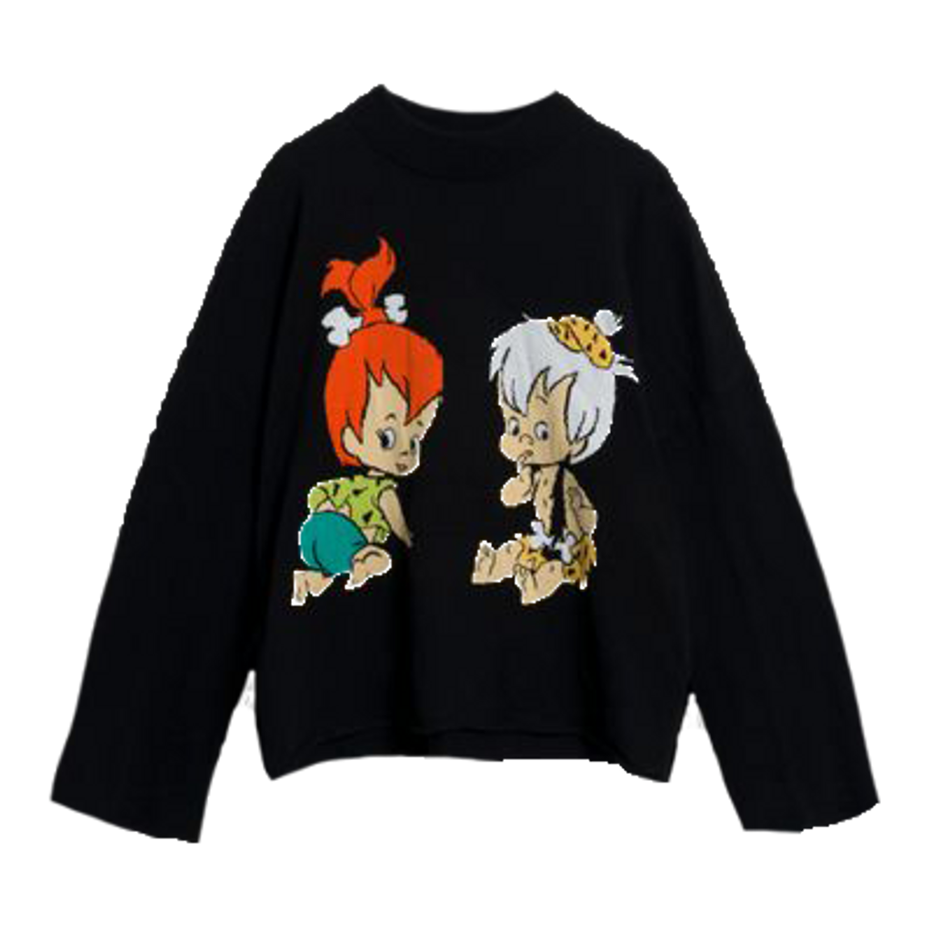 This Lazy Oaf x Flintstones Pebbles and Bam Bam knit jumper features an oversized fit, complete with mock neckline, dropped shoulders, and rolled hem. In excellent condition.