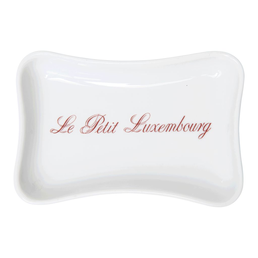 Le Petit Luxembourg Ashtray features printed calligraphy on white porcelain with text on the back.