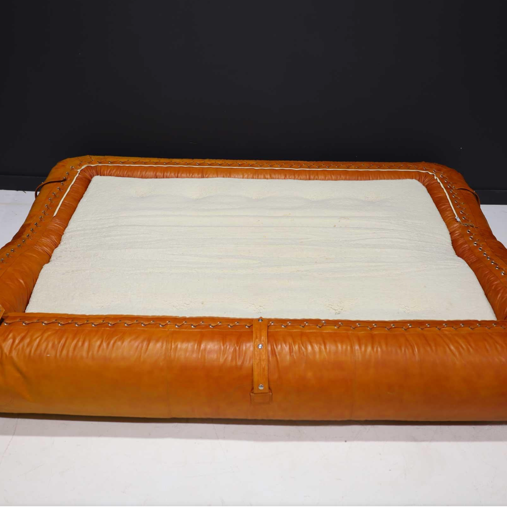 "Anfibio" sofa bed designed by Alessandro Becchi for Giovannetti Collezioni in 1970s in original leather. The sofa can be unfolded or opened flat, revealing its luxuriously soft sheepskin mattress.