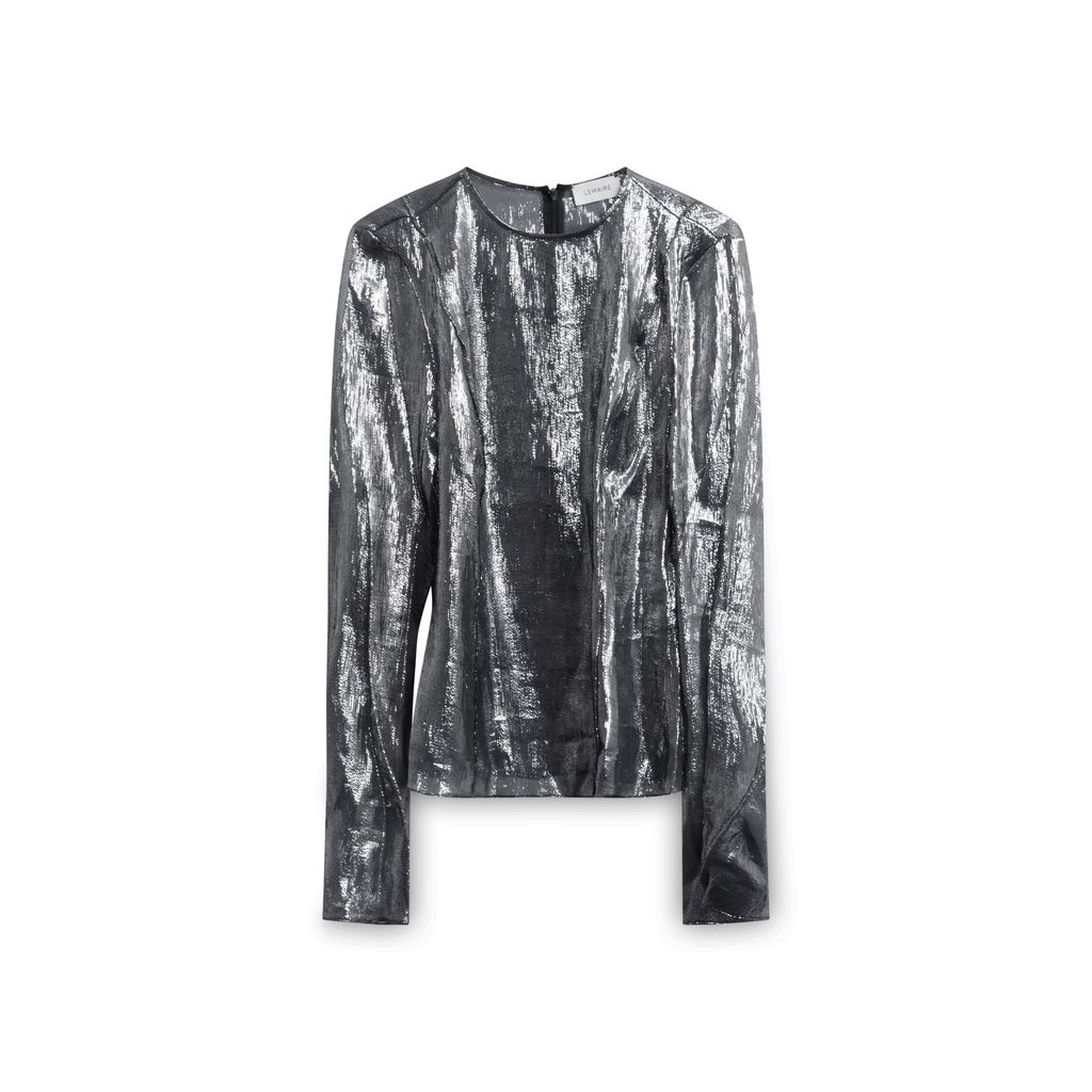 Silver metallic semi-sheer top with shaping seams in the front and back, made from a delicate silk blend. Slim fit. Zipper with hook closure in the back. Color: Silver. 75% Silk, 25% Polyester.