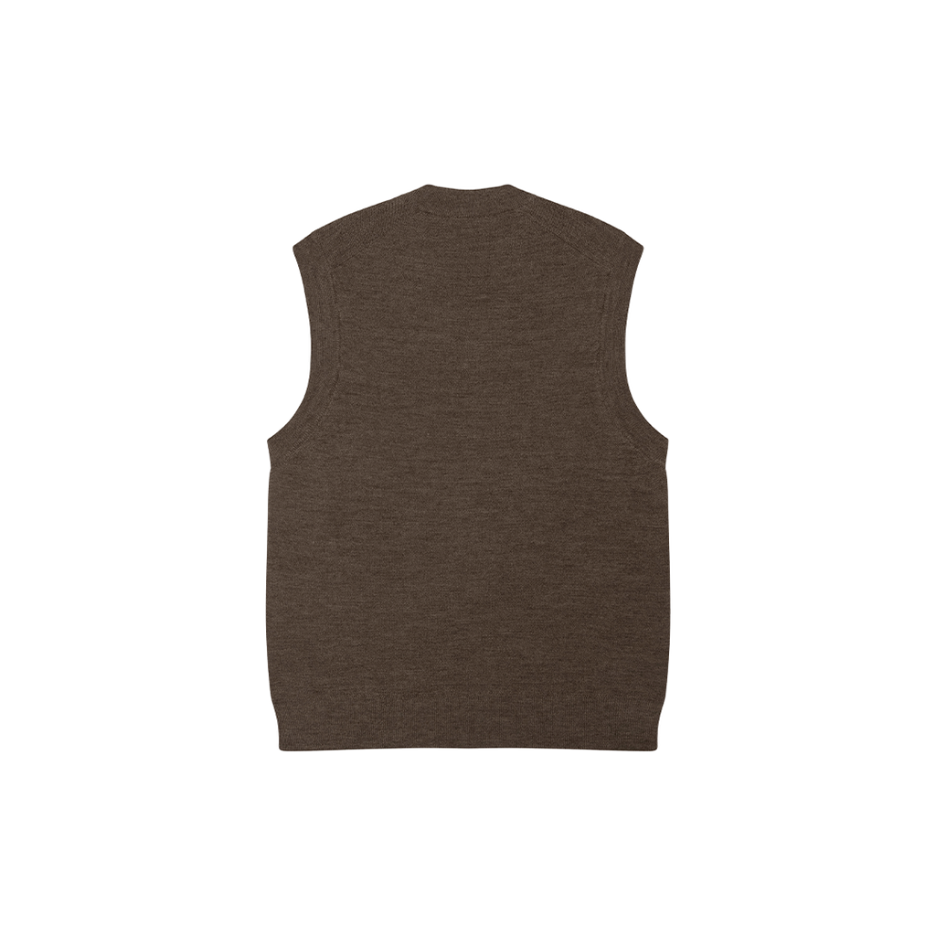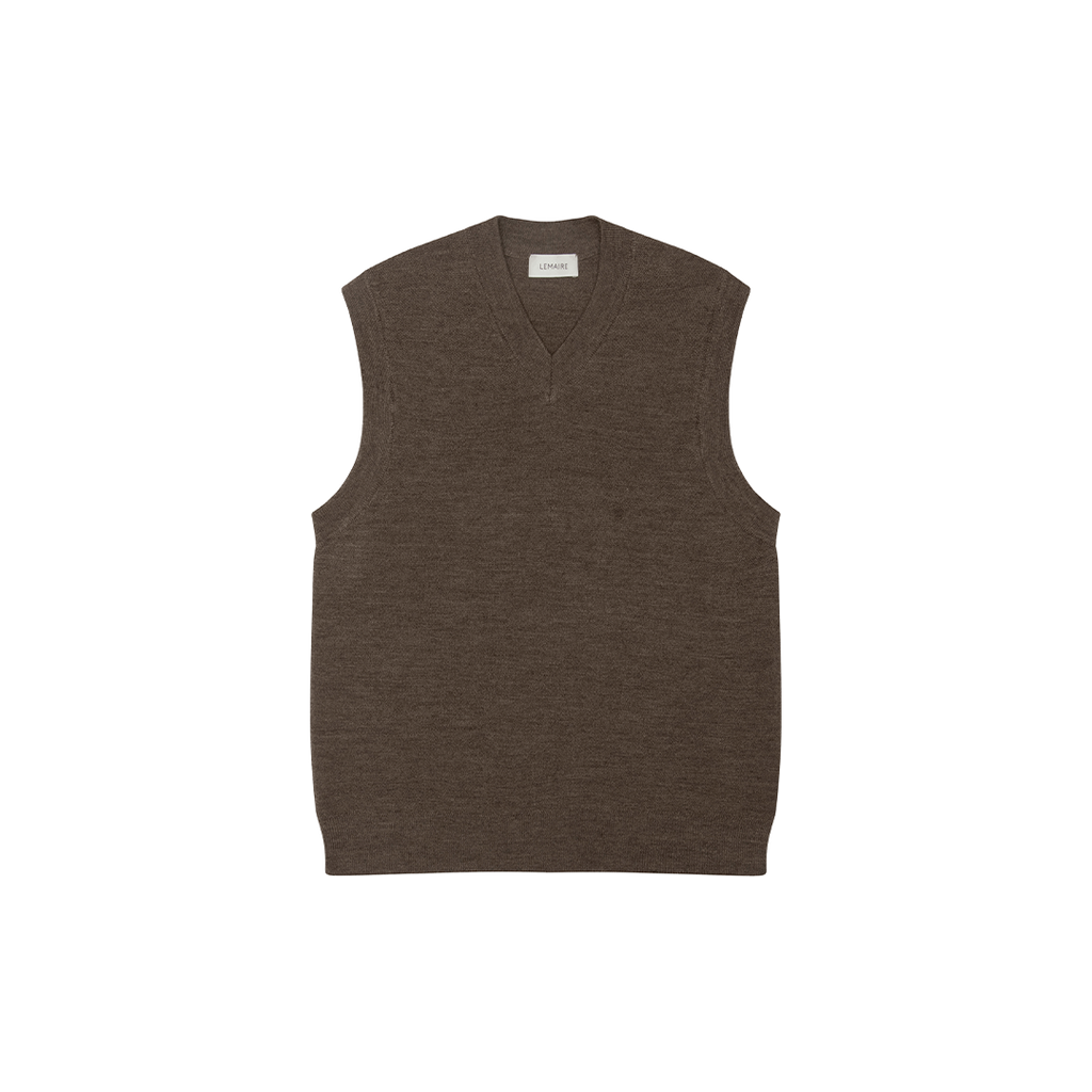 Lemaire Khaki V-Neck Vest features sleeveless design, rib knit V-neck collar, armscyes, and hem.