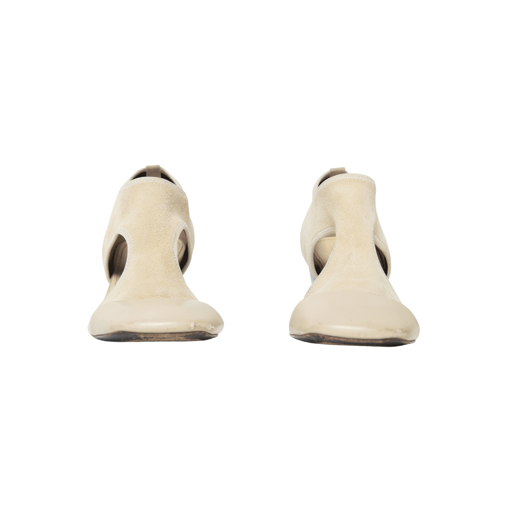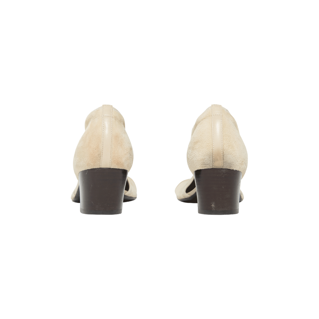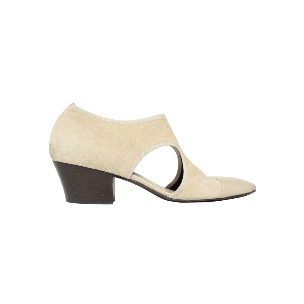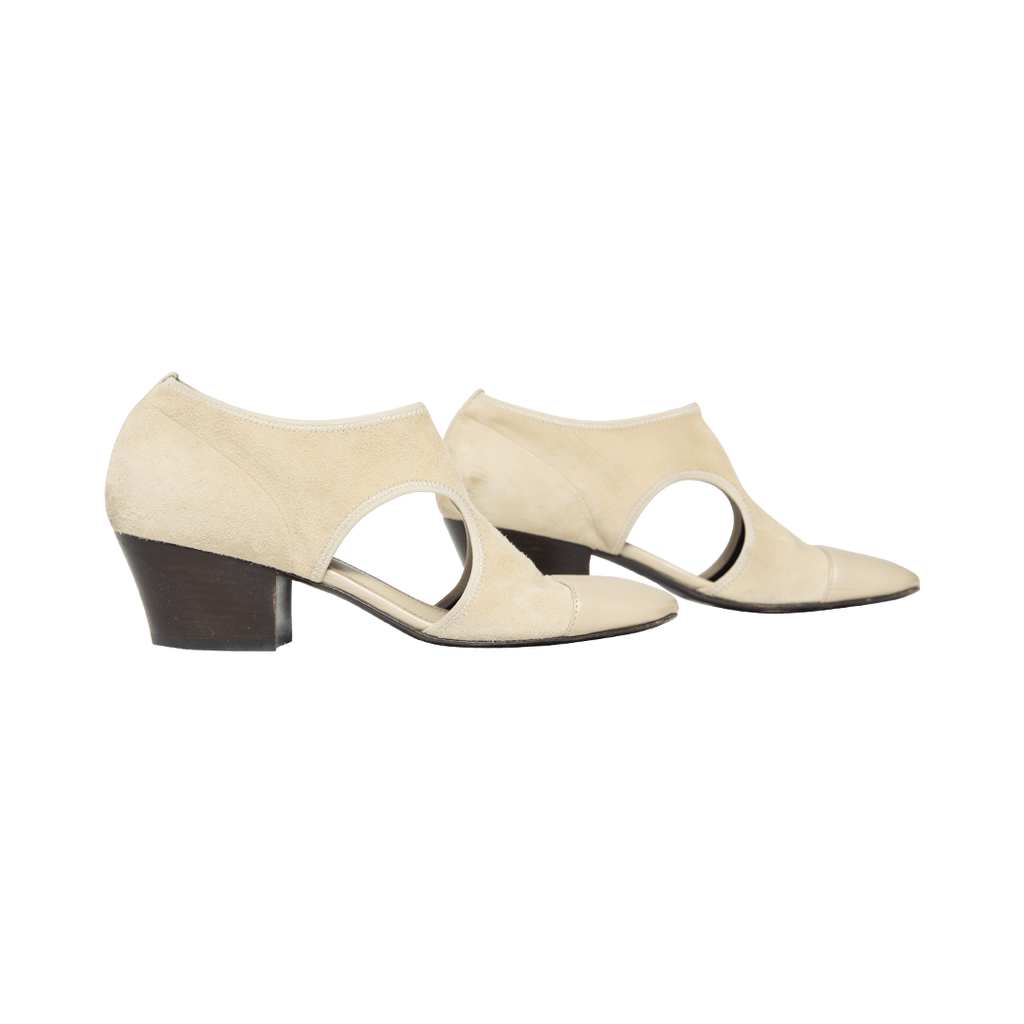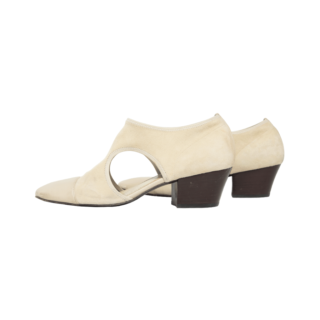 Lemaire Suede Cut-Out Heels features round toe and cut out design. Condition is fair with fading throughout and wear on the soles.
