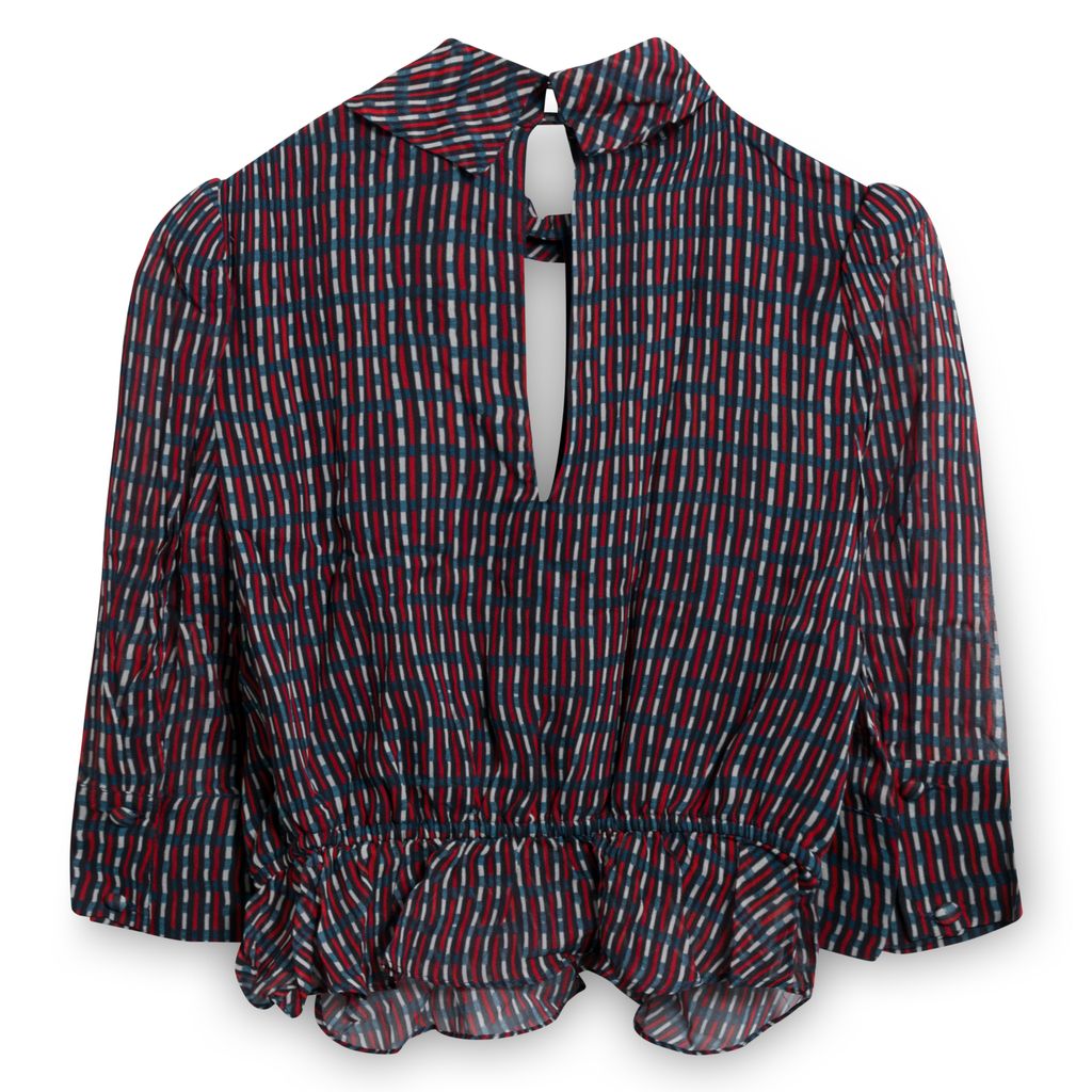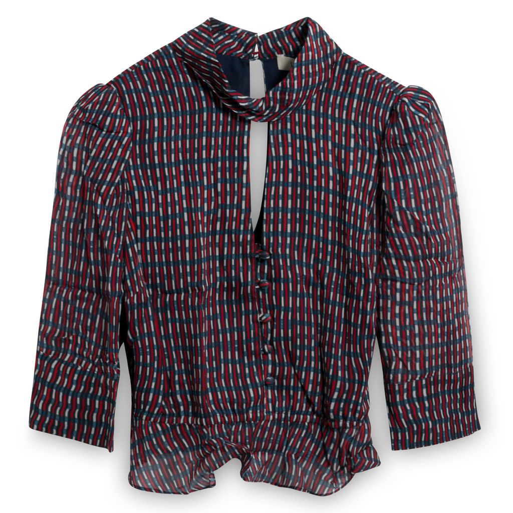 This fun feminine blouse from Lenon features a lightweight multicolor fabrication, a high neckline with a front keyhole, front button down closure, mid-length sleeves with buttoned cuffs, and an elastic stretch peplum waistline. Bodice is fully lined and in amazing condition. Shop the matching skirt, also listed for purchase on Marta's profile.