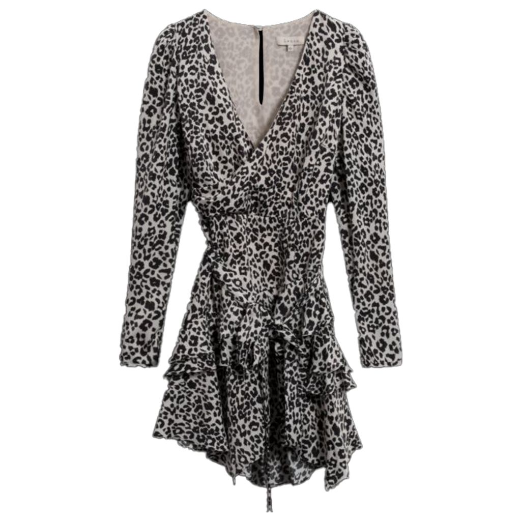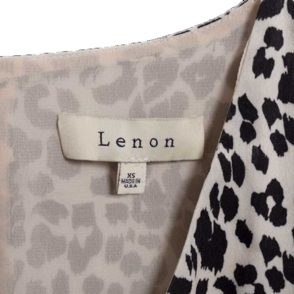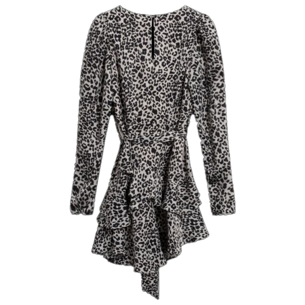 This matte satin leopard print mini dress features a statement shoulder with wrap front tie and tiered ruffle hemline. Finished with concealed side zipper closure and back button fastening. Lined. Gently worn, in good condition.