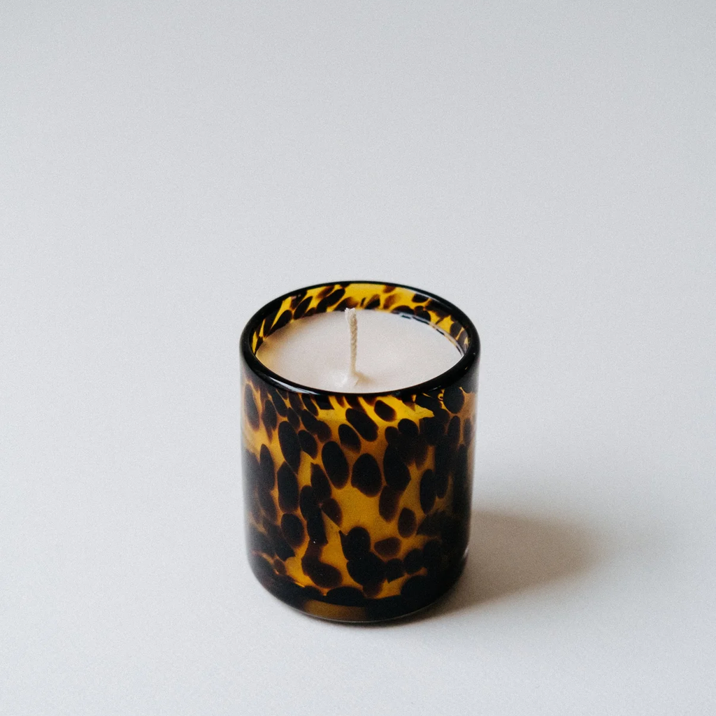 Leopard Glass Candle is made of 100% soy wax with notes of Tobacco-Dark Honey in a Belgian glass.