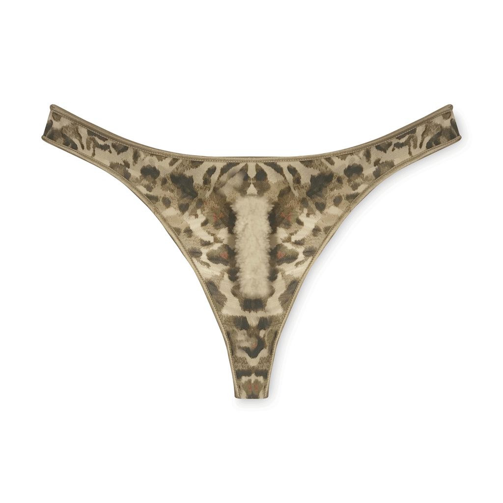 Comfortable thong features a removable shearling landing strip. The shearling is made from leftover factory cuttings helping to eliminate manufacturing waste. The key hole at center back is ornamented with the KZ signature hand casted brass jewelry.