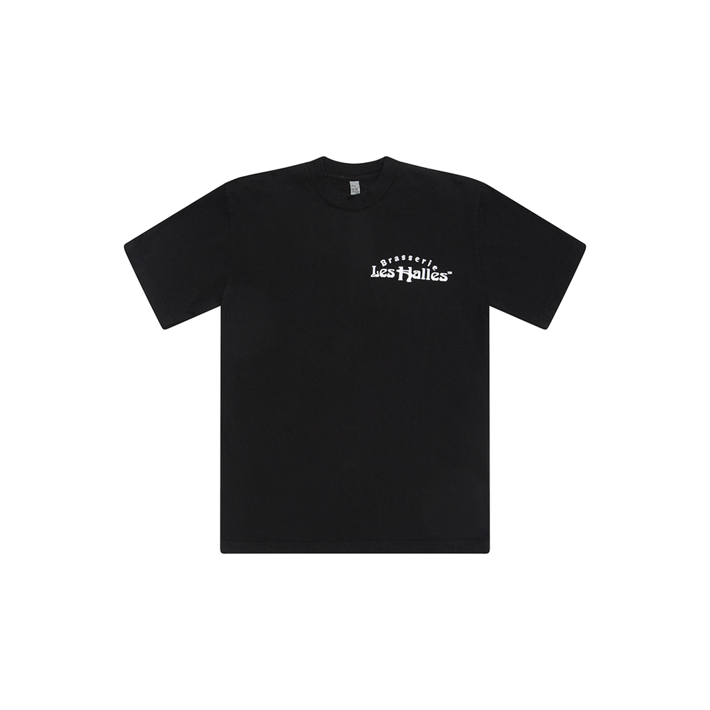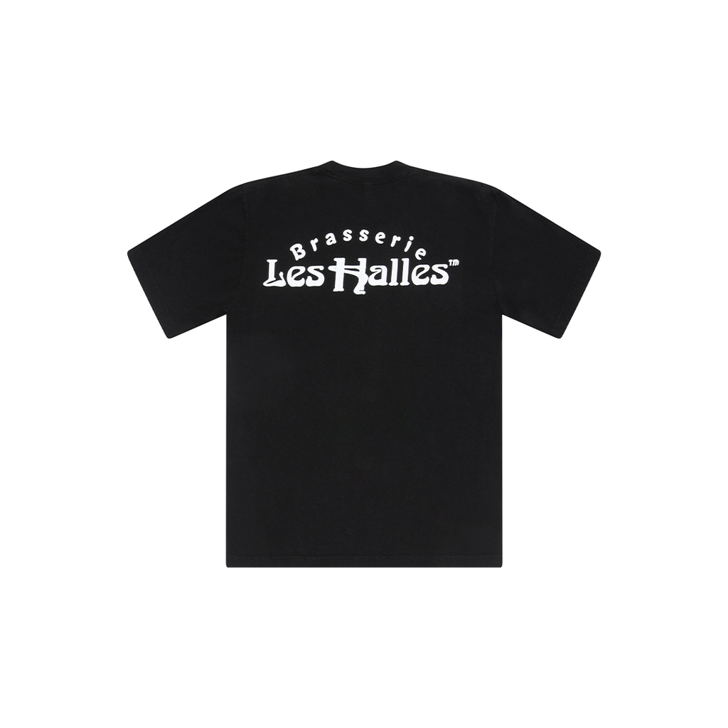 Les Halles Tee features classic crew neck collar and graphic design.