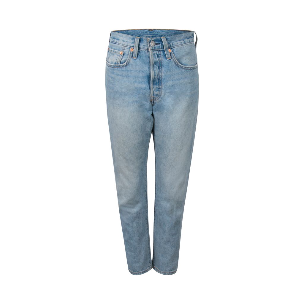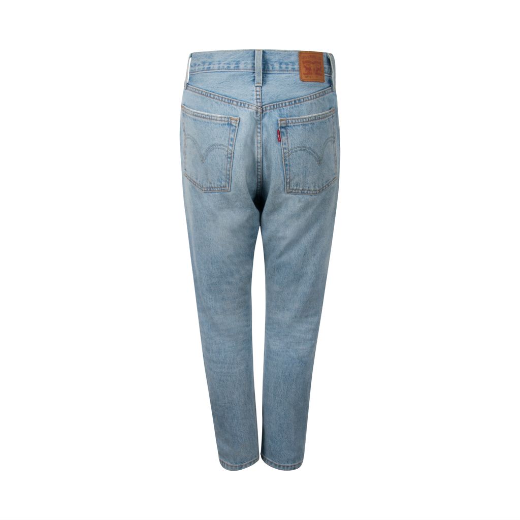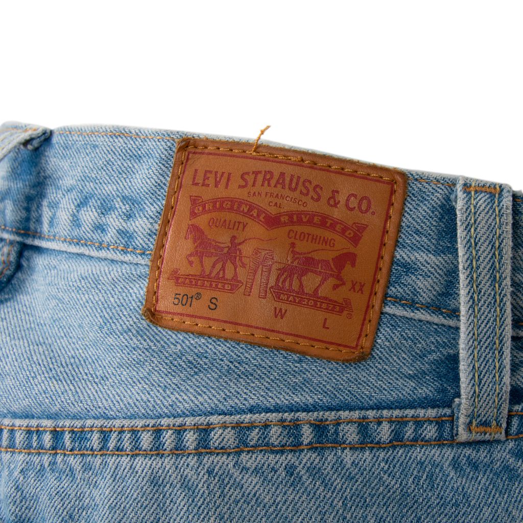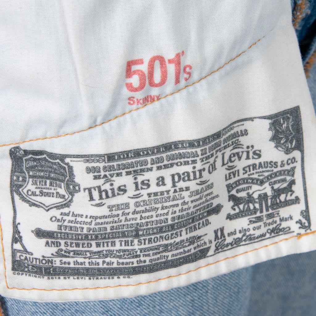 These light wash denim Levi jeans feature a classic button-fly closure, have a high-waist, functional front/back pockets, and have a tapered silhouette. Gently worn, in good condition. Wear and tear throughout, marks as pictured.