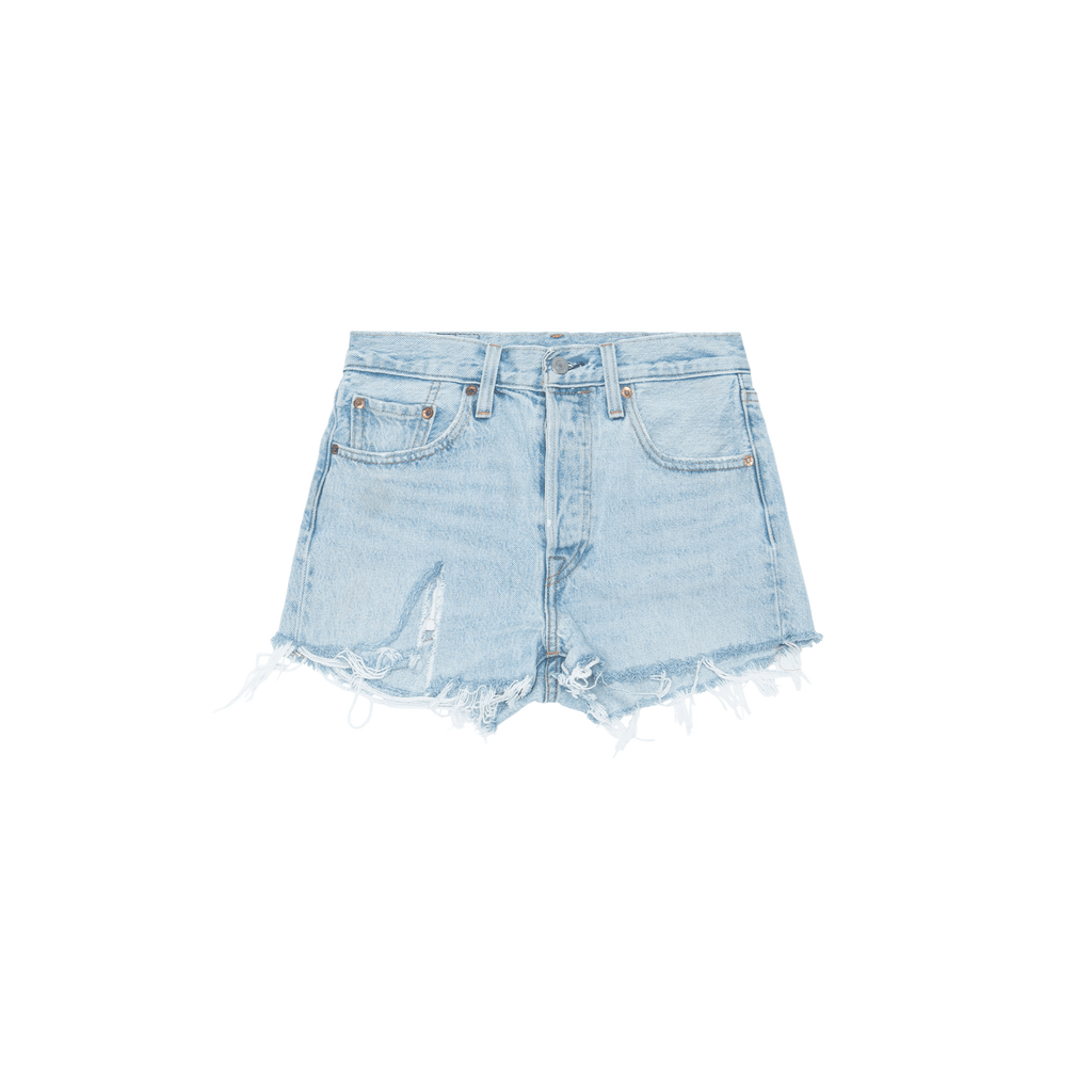 Levi's Cutoff Jean Shorts features high waist, raw hem, front button closure, and 5 pocket styling.