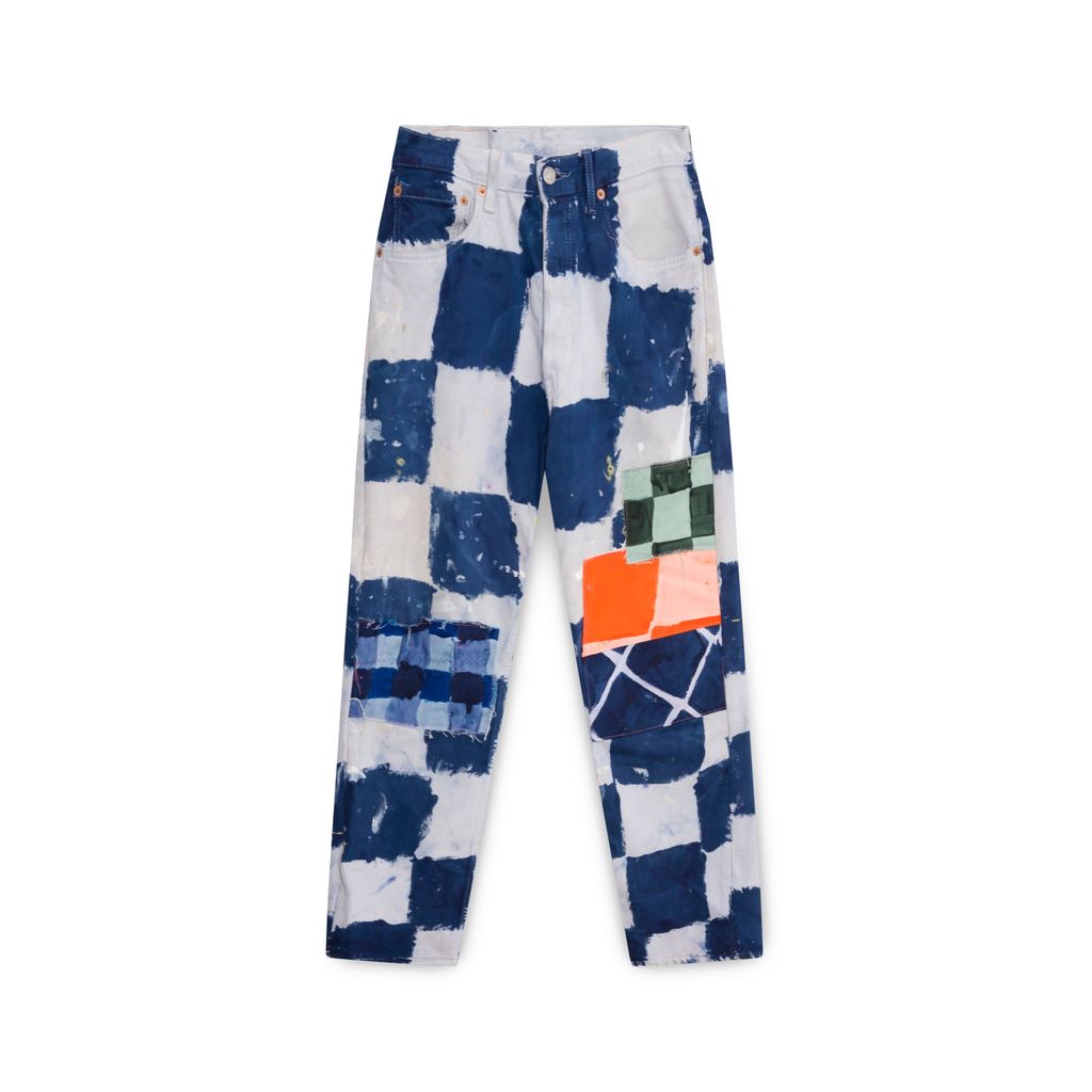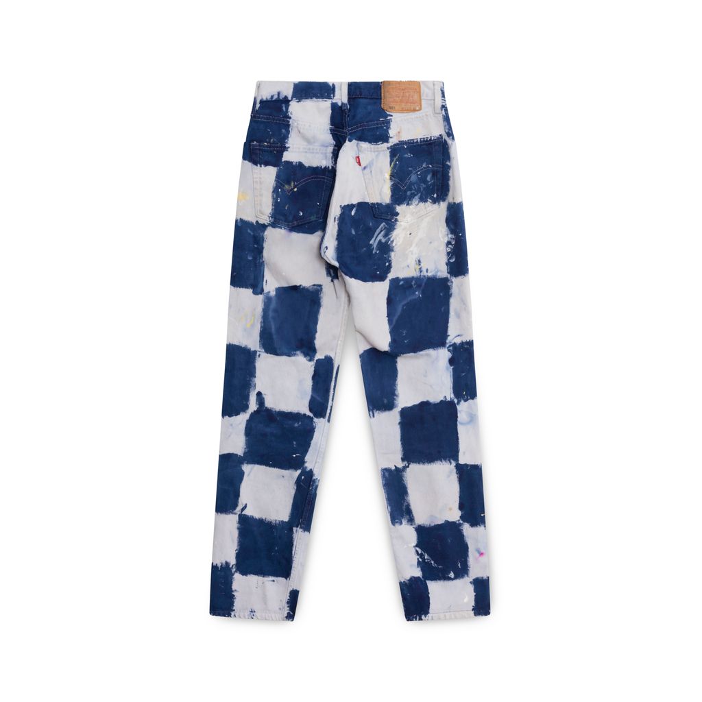 Painted Patchwork Levi's Jeans features checkered and paint-splattered pattern, contrasting color checkered patches on front knees, belt loops, 5 pocket-style, logo patch on back, button-fly.