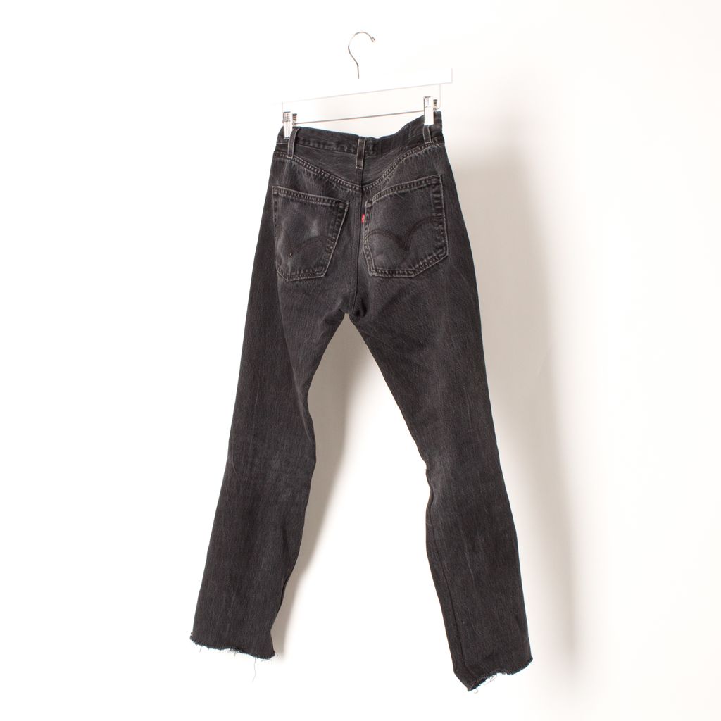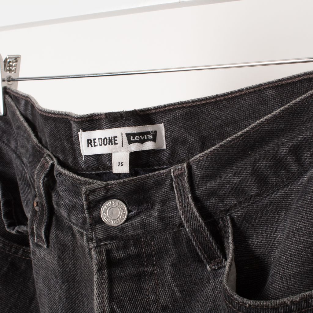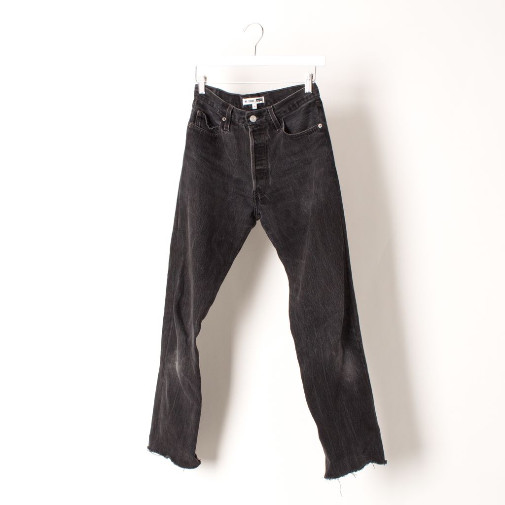 Like new, high rise black jean from Levi's Re-Done. 100% cotton, cropped leg, featuring a 11 1/4" front rise and a vintage washed finish.