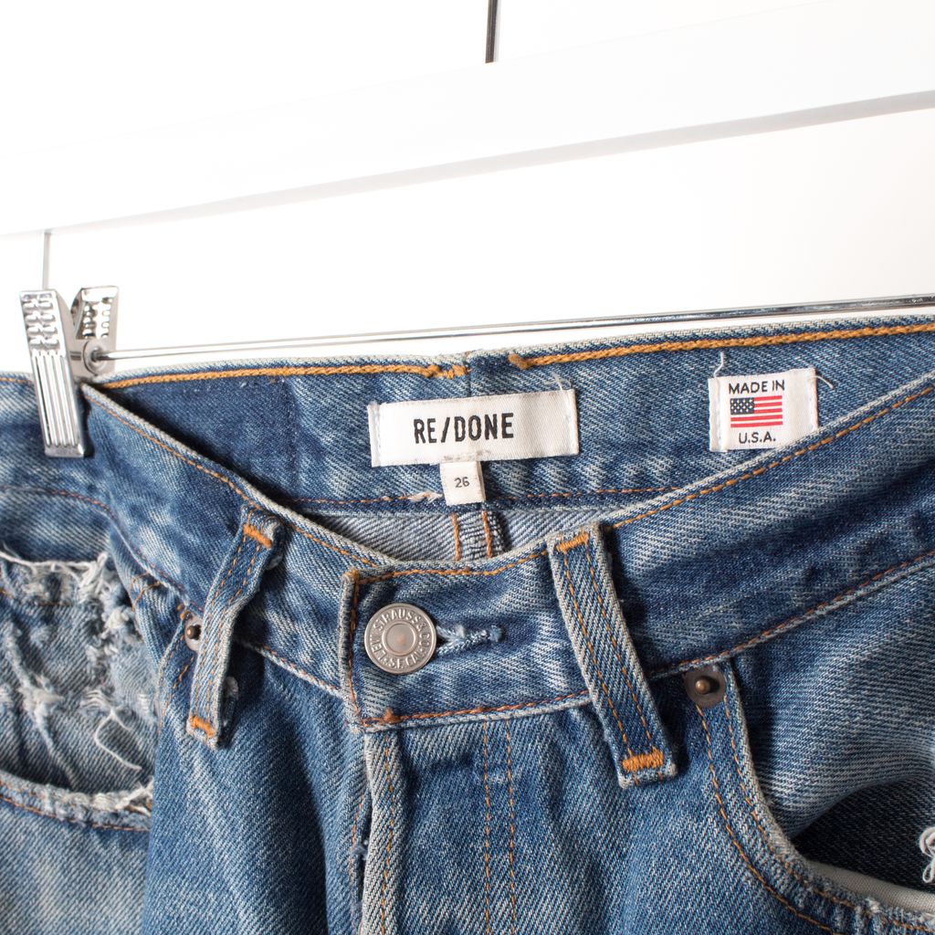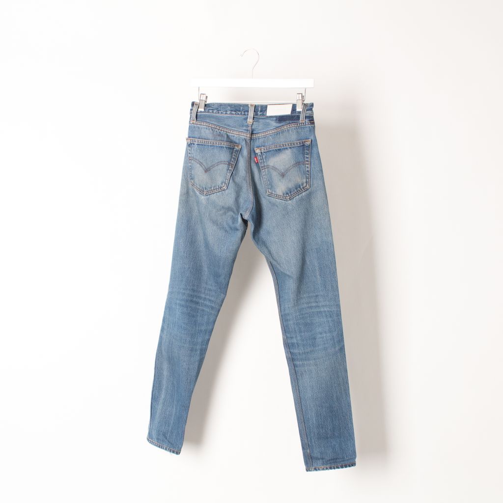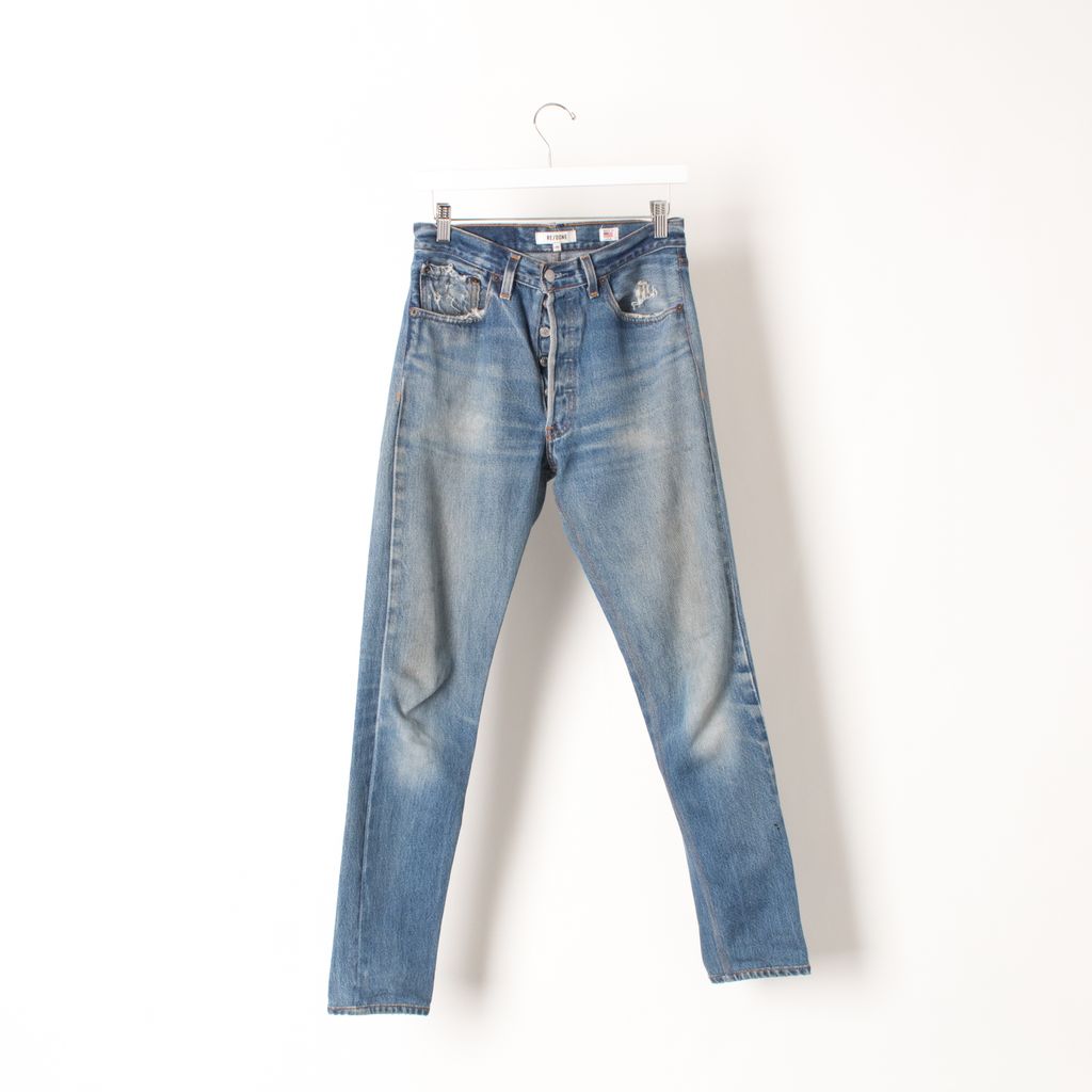 Gently worn, Re-Done vintage Levi's. Classic five pocket, standard fit, natural vintage wash, slight distressing.