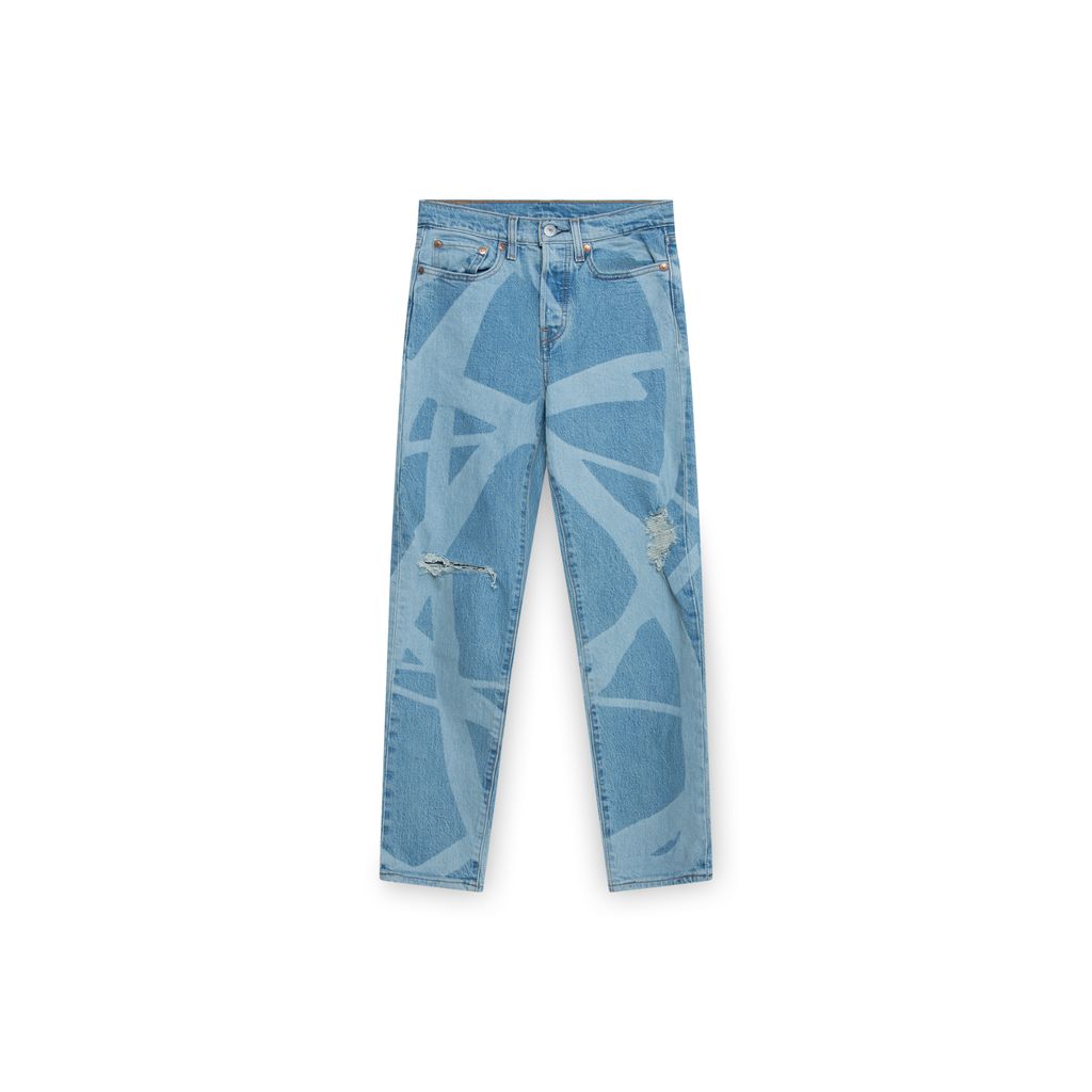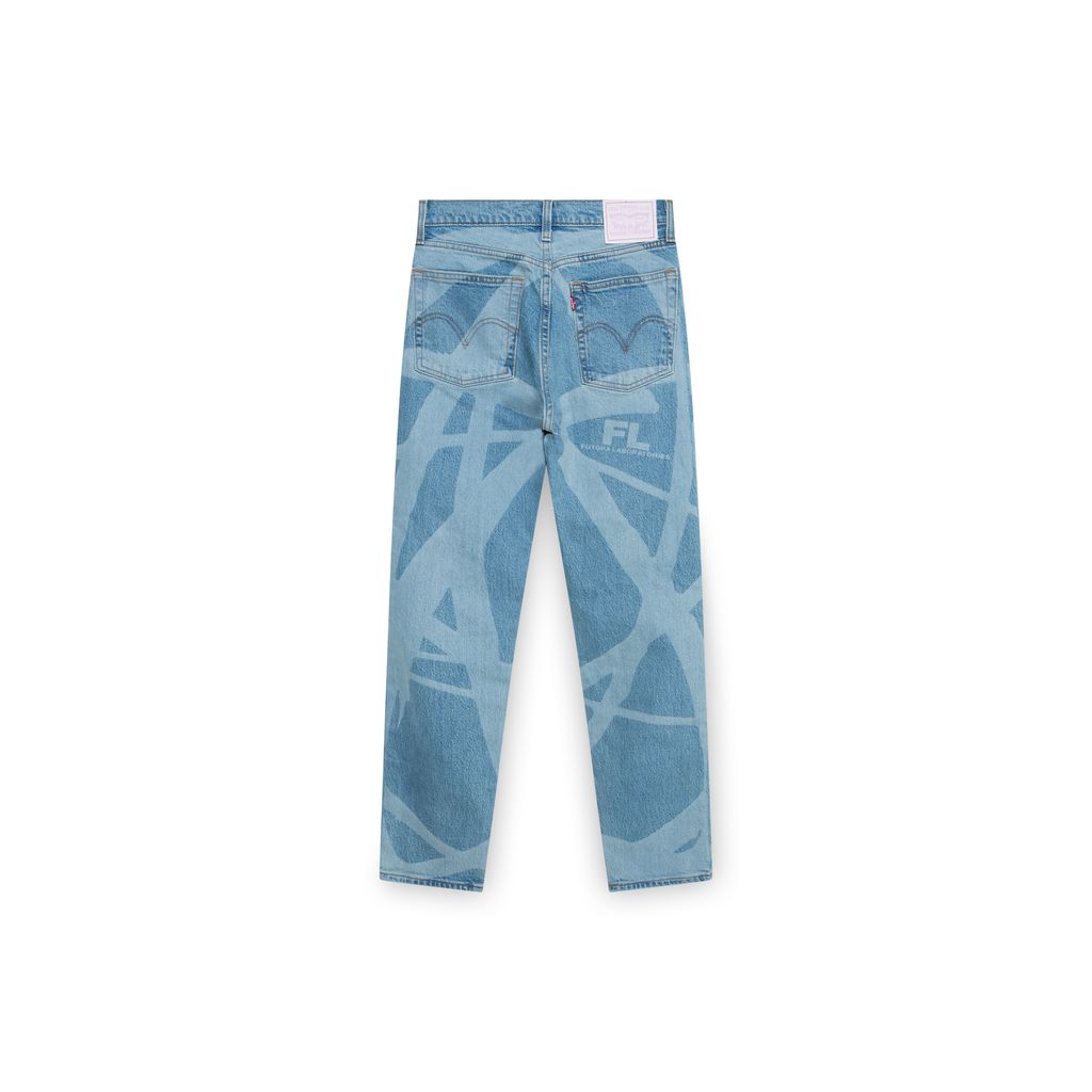 Levis x Futura Laboratories laser jeans features pattern throughout, distressed at knees, five pockets throughout, and button and zipper closure at front.