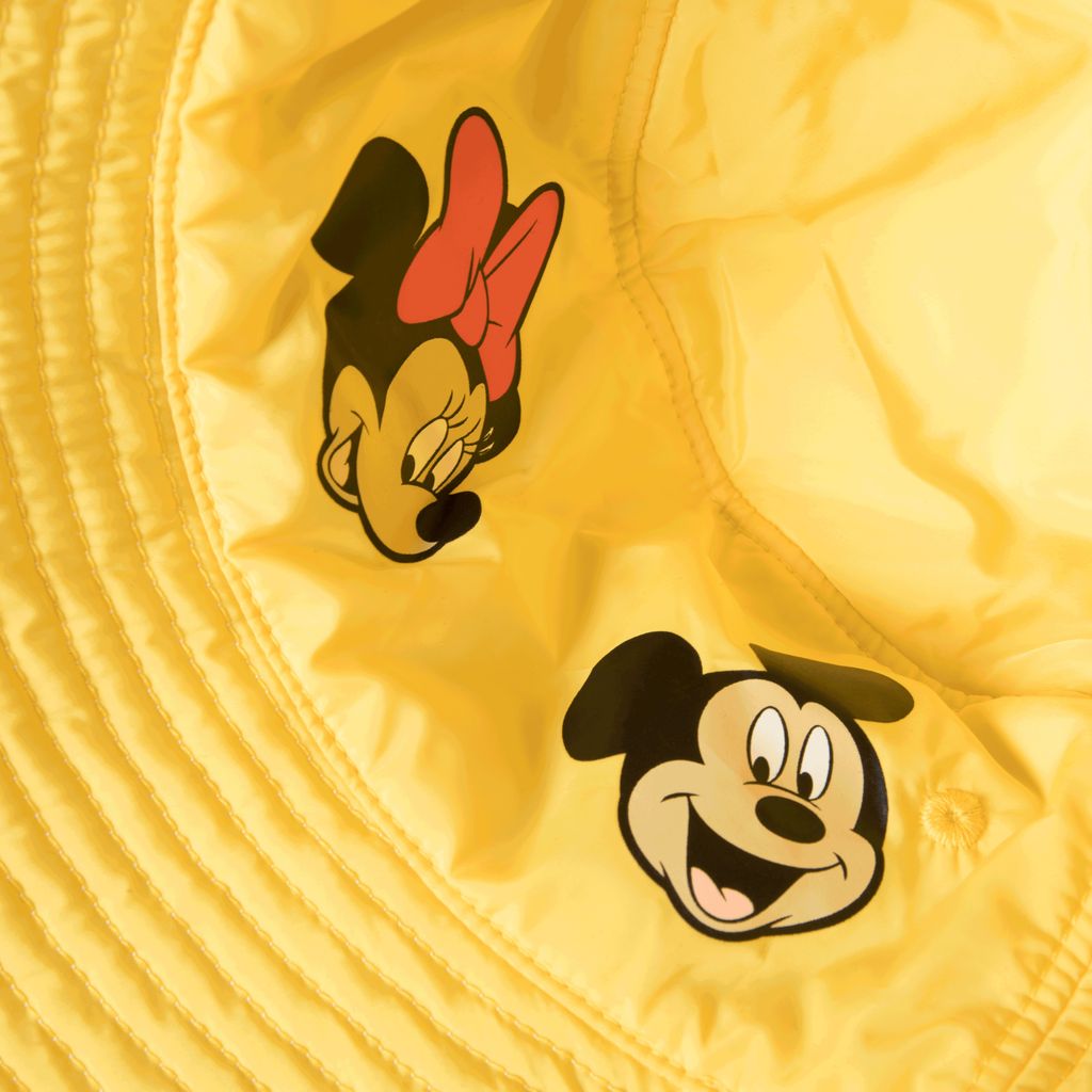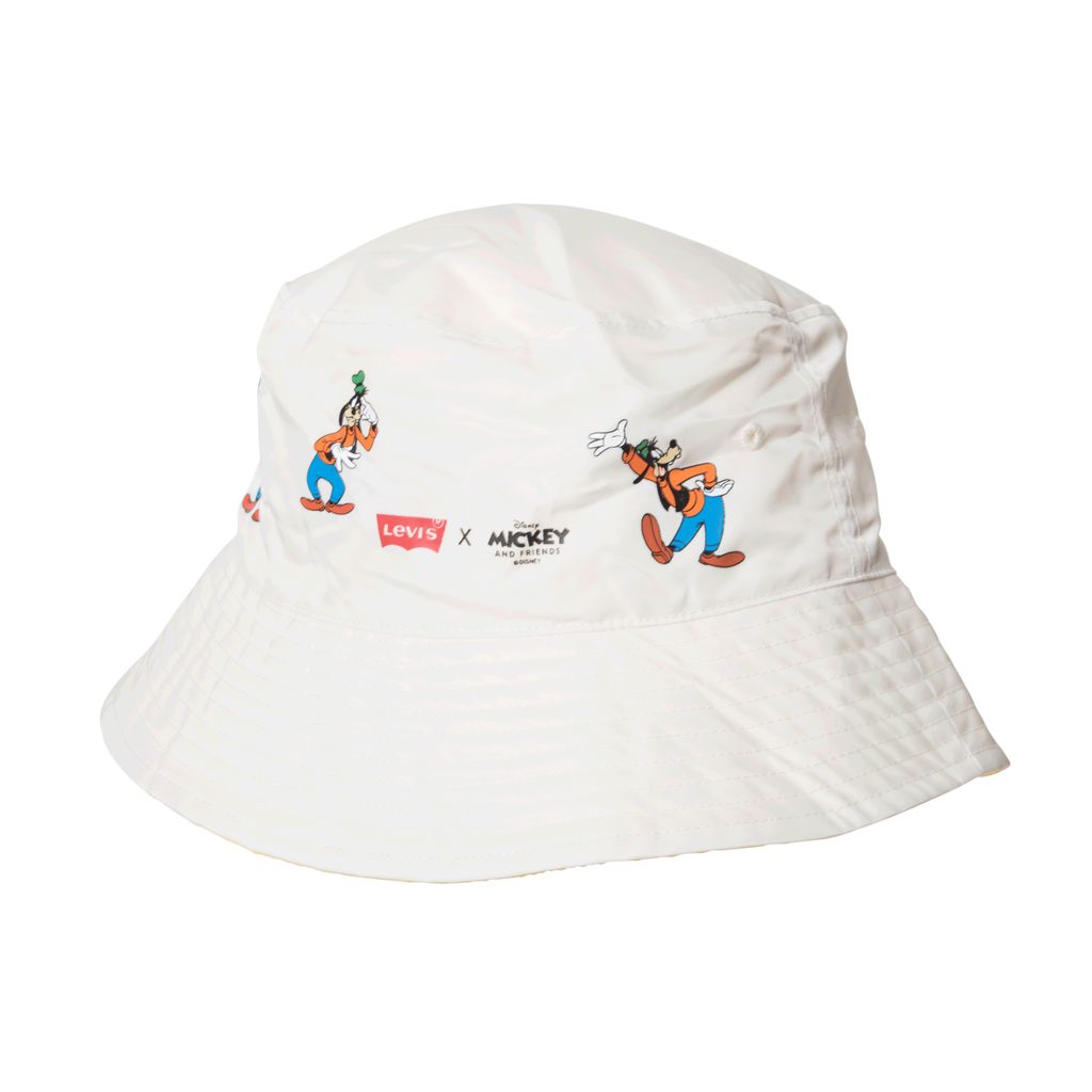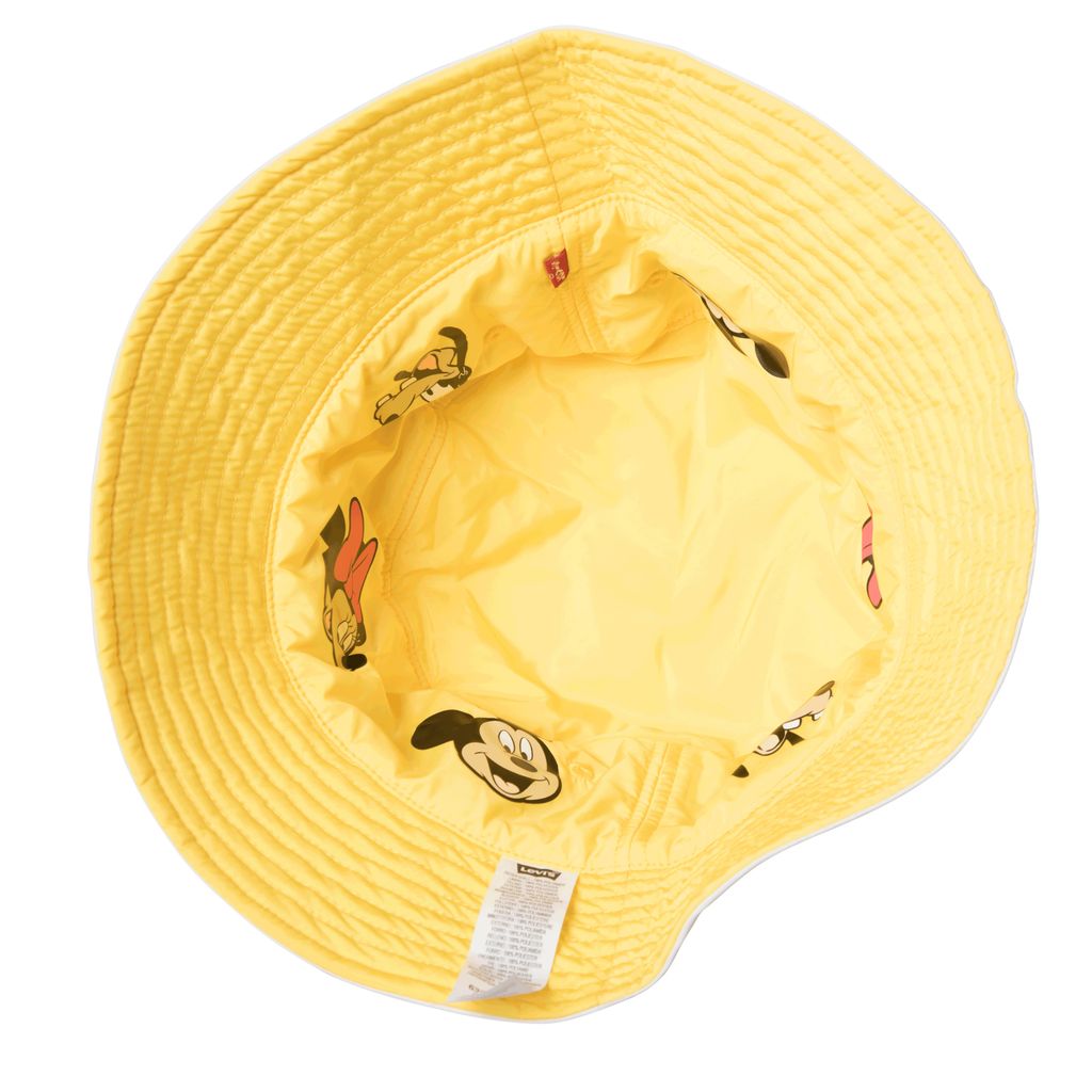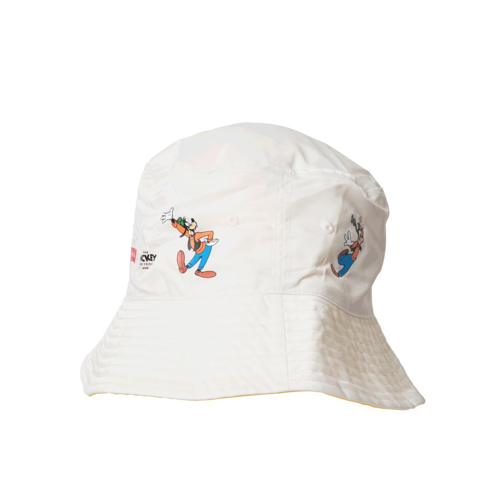 Levi's x Mickey and Friends reversible bucket hat features dual yellow and white sides along with Disney characters.