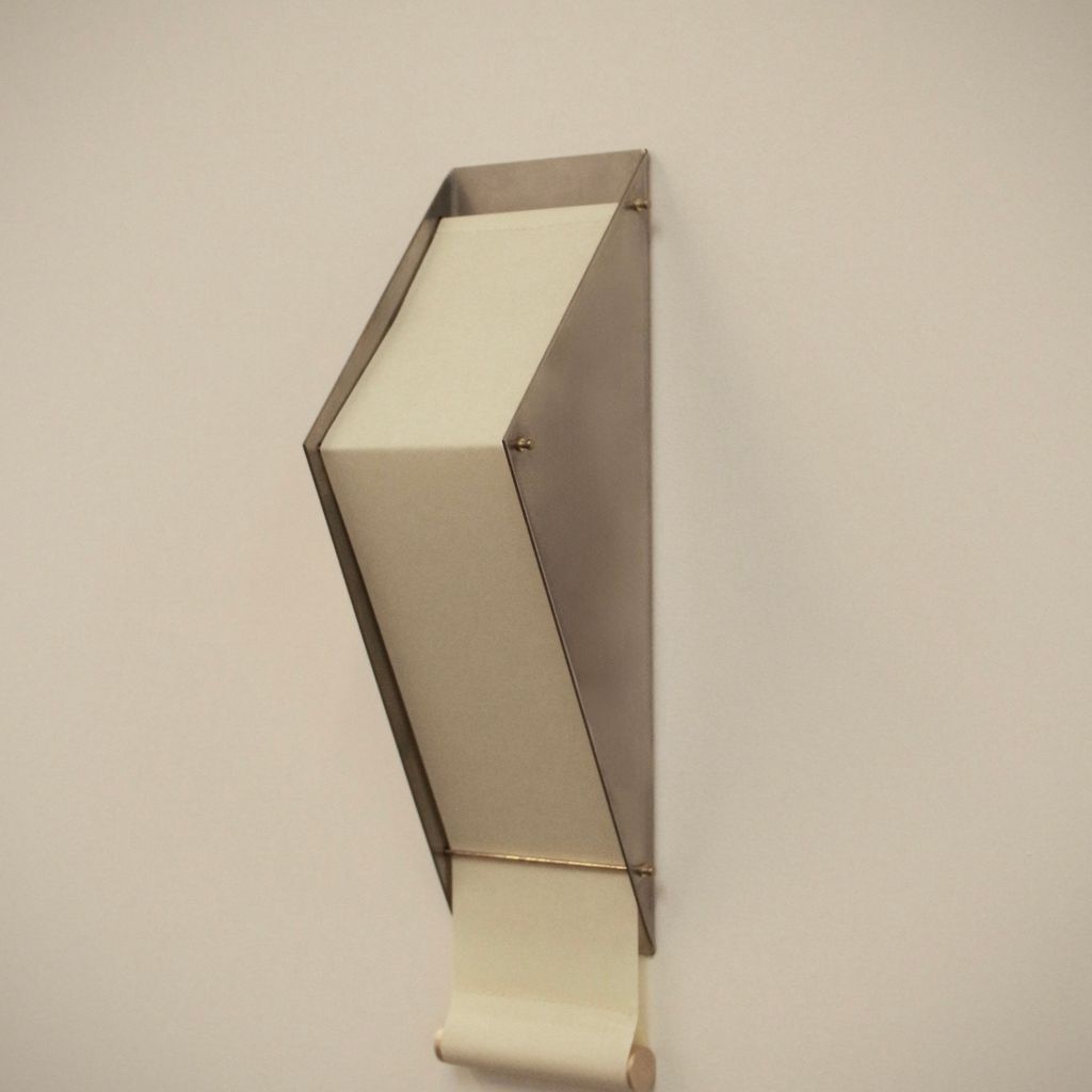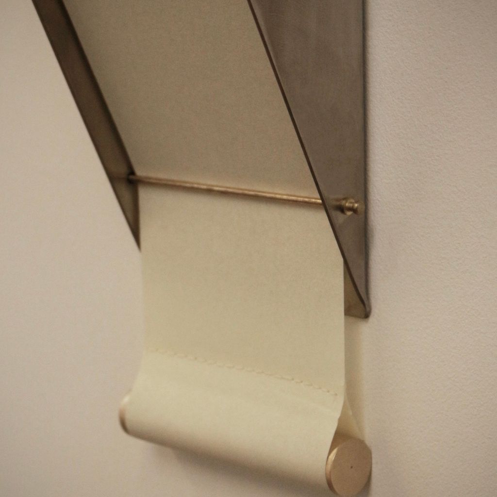 Inspired by celestial instruments and the organic architecture of Oscar Niemeyer, whose designs left a lasting impression on Ávila during his upbringing in Brasília, the Libra Wall Lamp nods to a bygone era, while remaining distinctly modern and rooted in the present. A triangular stainless steel base anchors this piece while its light is softly diffused through a sheet of parchment paper, secured by a simple, metal scroll. When lit, the lamp emits a warm glow, subtly casting the shadow of the outer steel structure.