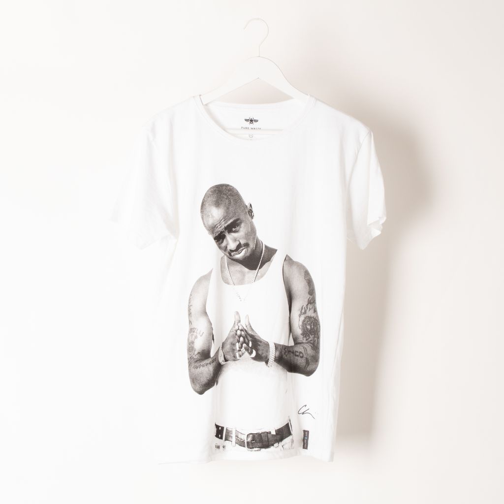 Gently worn, Tupac tee from Mens Sustainable. From their site, "I chose Pure Waste, from Helsinki Finland, as a partner in this because we both believe strongly that we must all Stop Wasting Earth's Resources. We made these products to bring attention to the fact that water is too precious of a commodity to be wasted. Few know that it takes more than 2,900 gallons of water to grow a little over 2 pounds of cotton. For the rest of the world that's 11,000 liters to grow 1 kilogram of cotton. The Tupac Chi-shirt he is wearing saved over 700 gallons or 2700 liters of water in its manufacturing process. It's made from 100% recycled material. Look good, do good!"