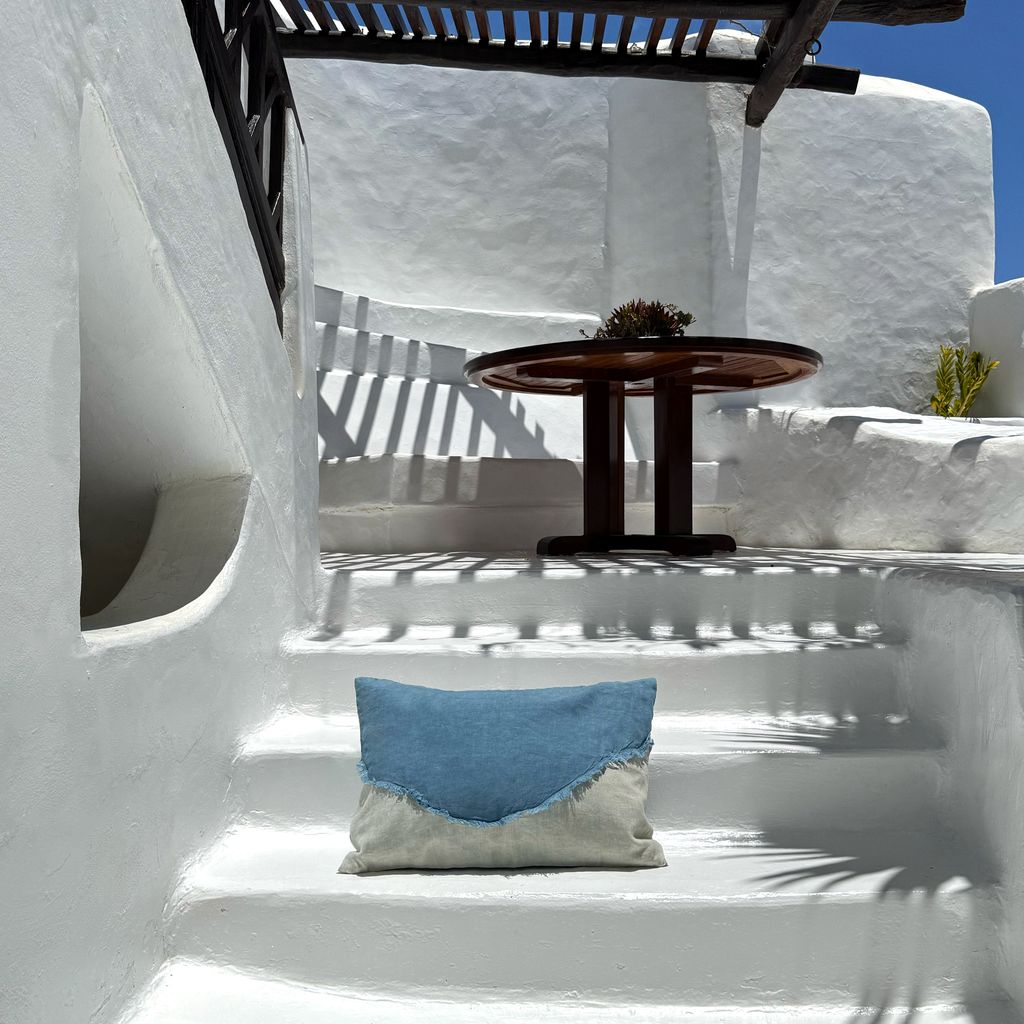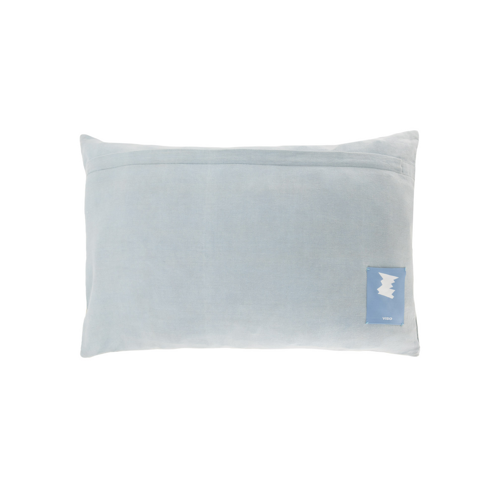 The two-tone design features soft sky blue and washed indigo colors drawn from plant dyes.