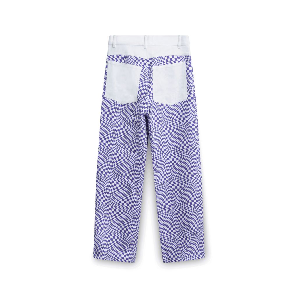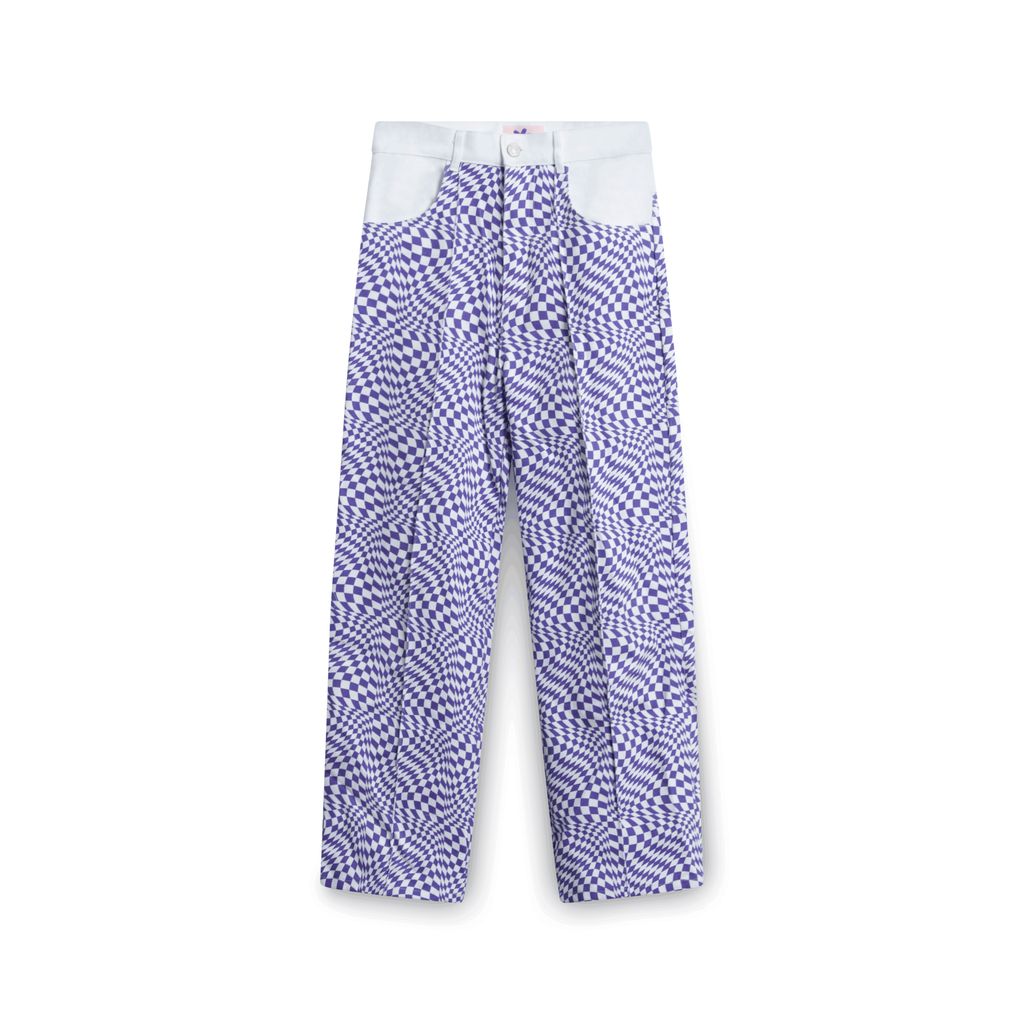 White and purple checkered pants that wrap in certain areas of the pant. Waist and pockets are white, with a silver button and zipper enclosing the pants.