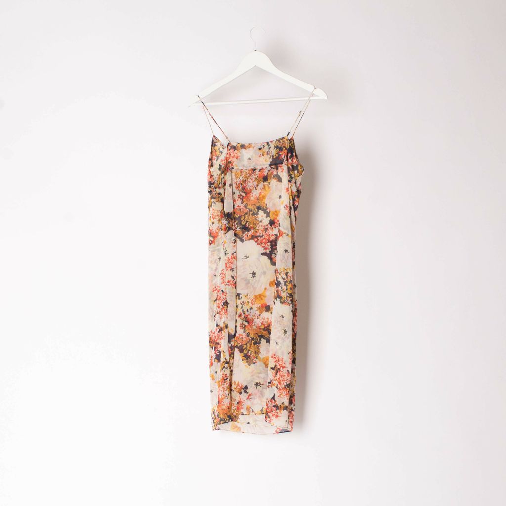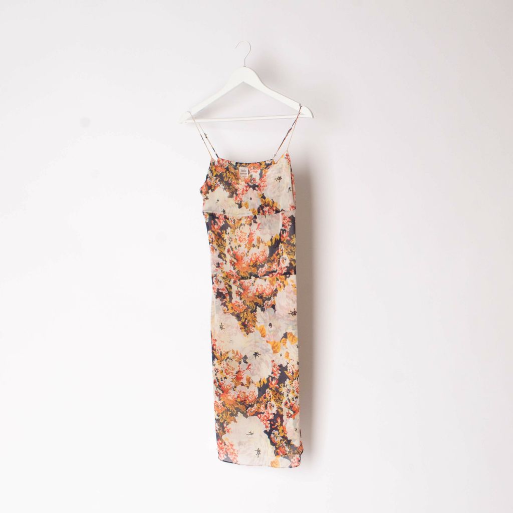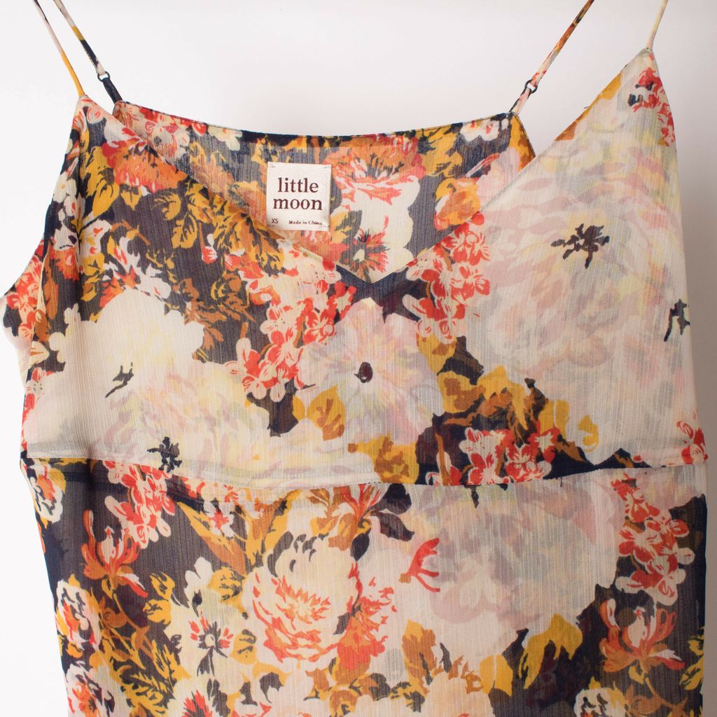 Little Moon floral printed slip style midi dress with side slits, adjustable straps and a v neckline. Size XS.