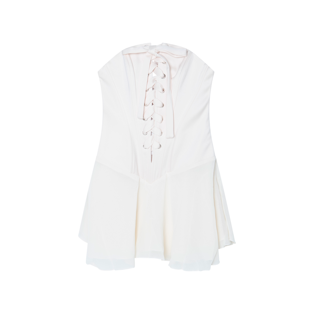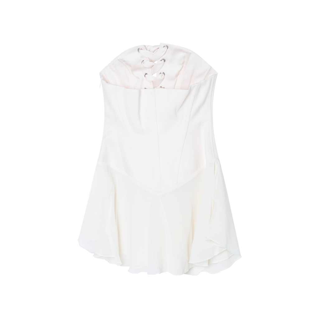 Livia Corset Dress features removable adjustable straps, corset with boned bodice, front adjustable tie straps, semi sheer chiffon, and stretch satin and stretch mesh.