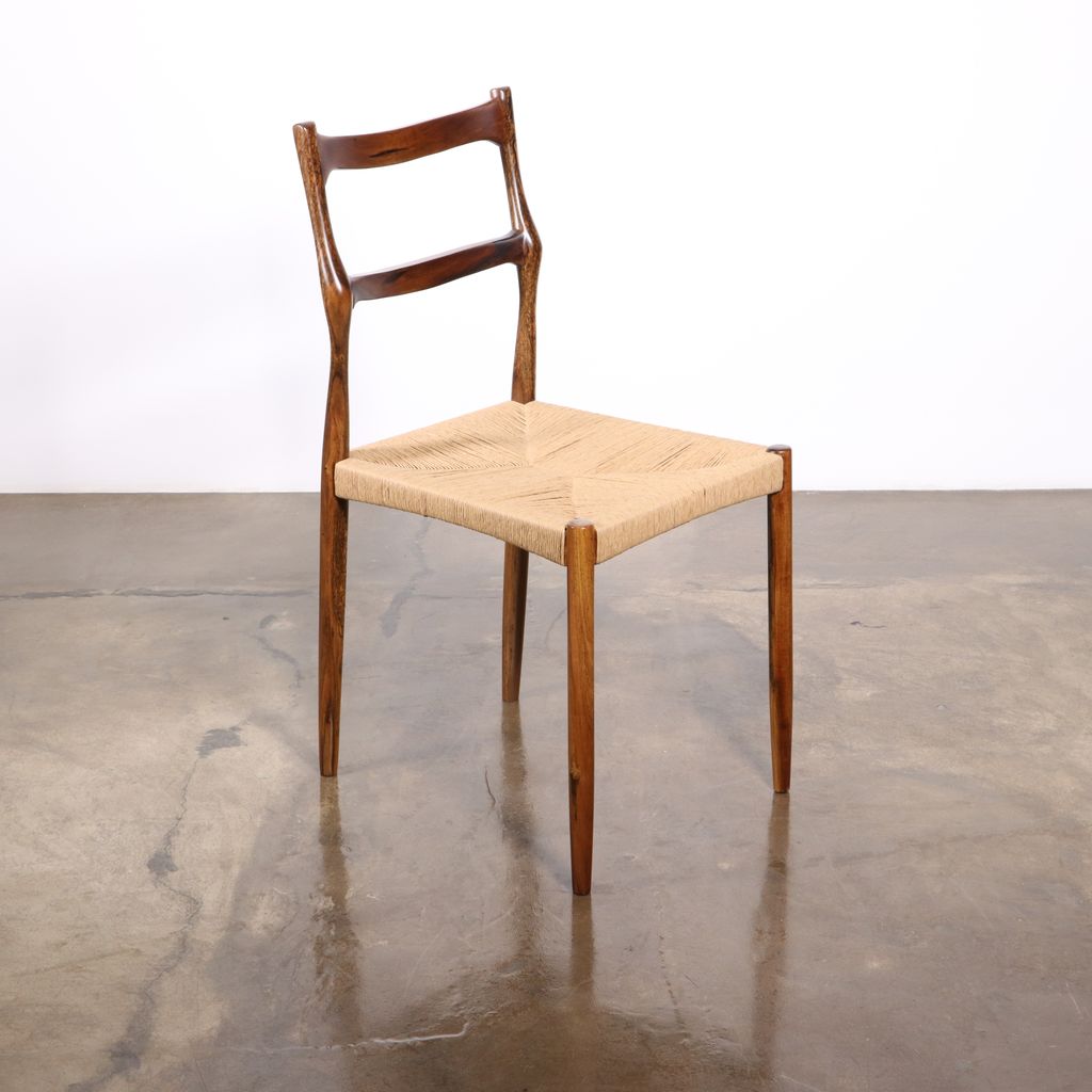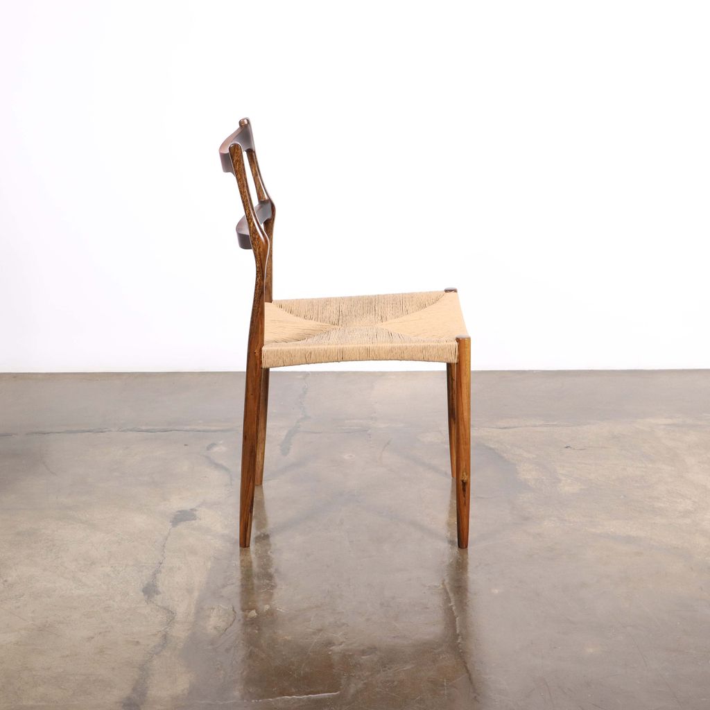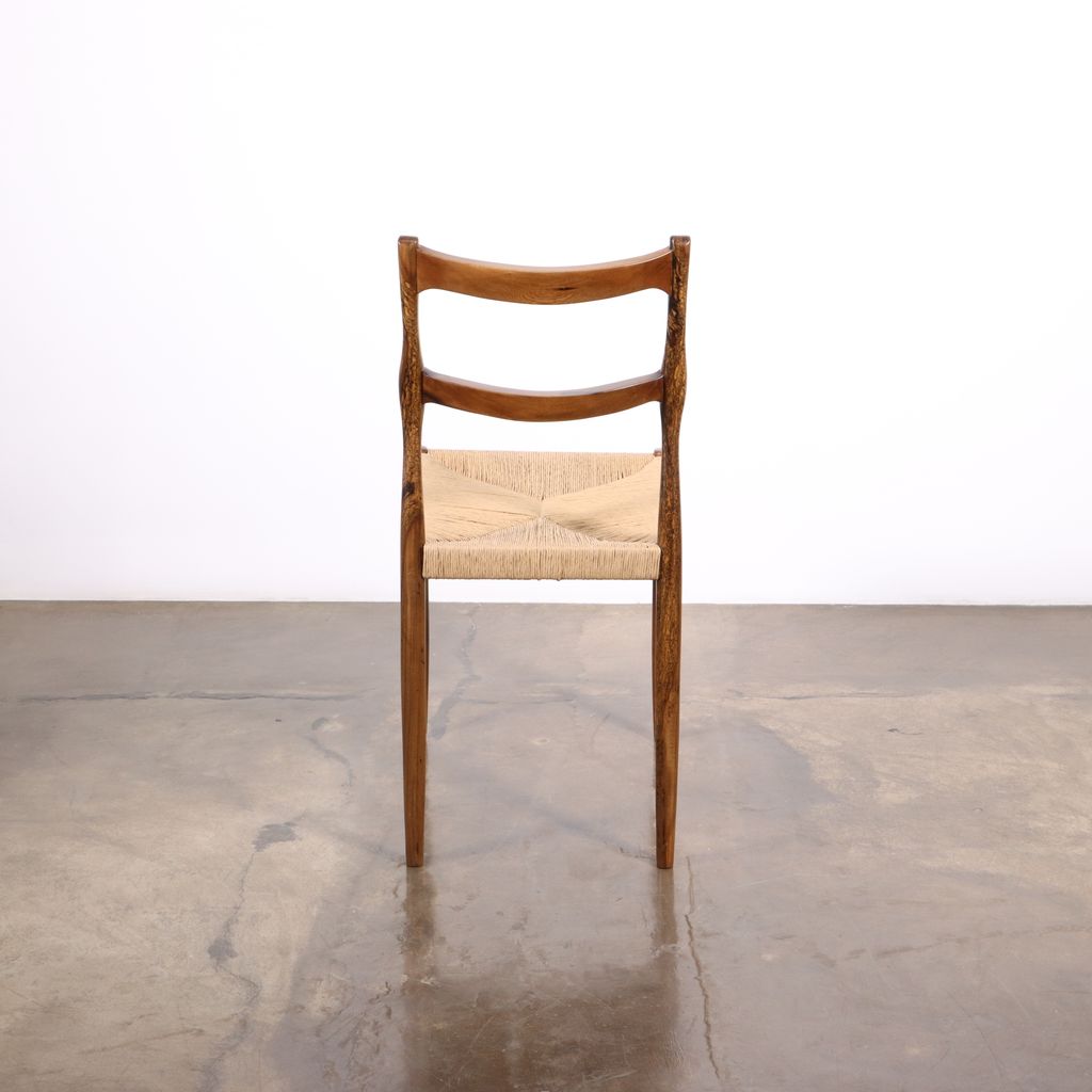 Our homage to Gio Ponti’s Superleggera chair features a thin hand-carved frame and hand woven rush seat. Shown in Argentine Rosewood with carefully selected planks to maximize landscaping across the carved details on the back leg. Available as shown or in the wood, finish and upholstery of your choice, or with hand woven rush as shown.
