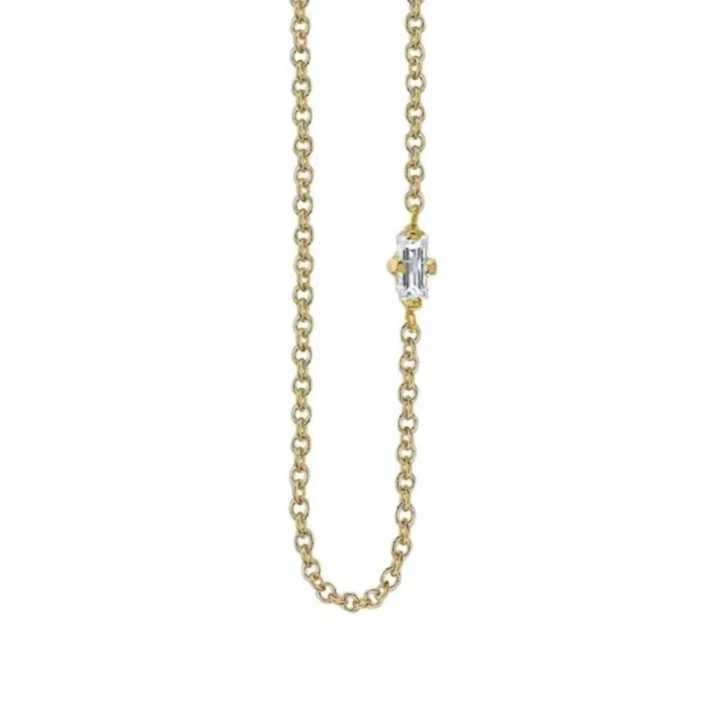 This Lizzie Mandler necklace features a single baguette-cut white diamond , prong-set in 18k yellow gold and suspended on a delicate 14k gold chain. Refined and barely there—yet undeniably luxe. A quiet spark with modern edge.