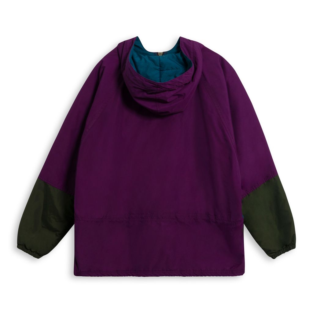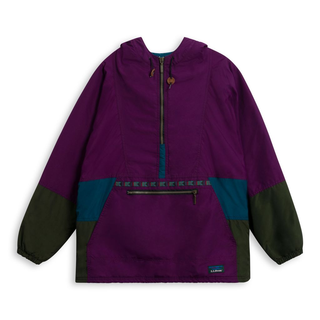 This vintage hooded half-zip pullover jacket from LL Bean features a large front patch pocket with zip and side slit pocket detail. Finished with elasticized cuffs and drawstring cords for a customized fit. Gently worn, in good condition.