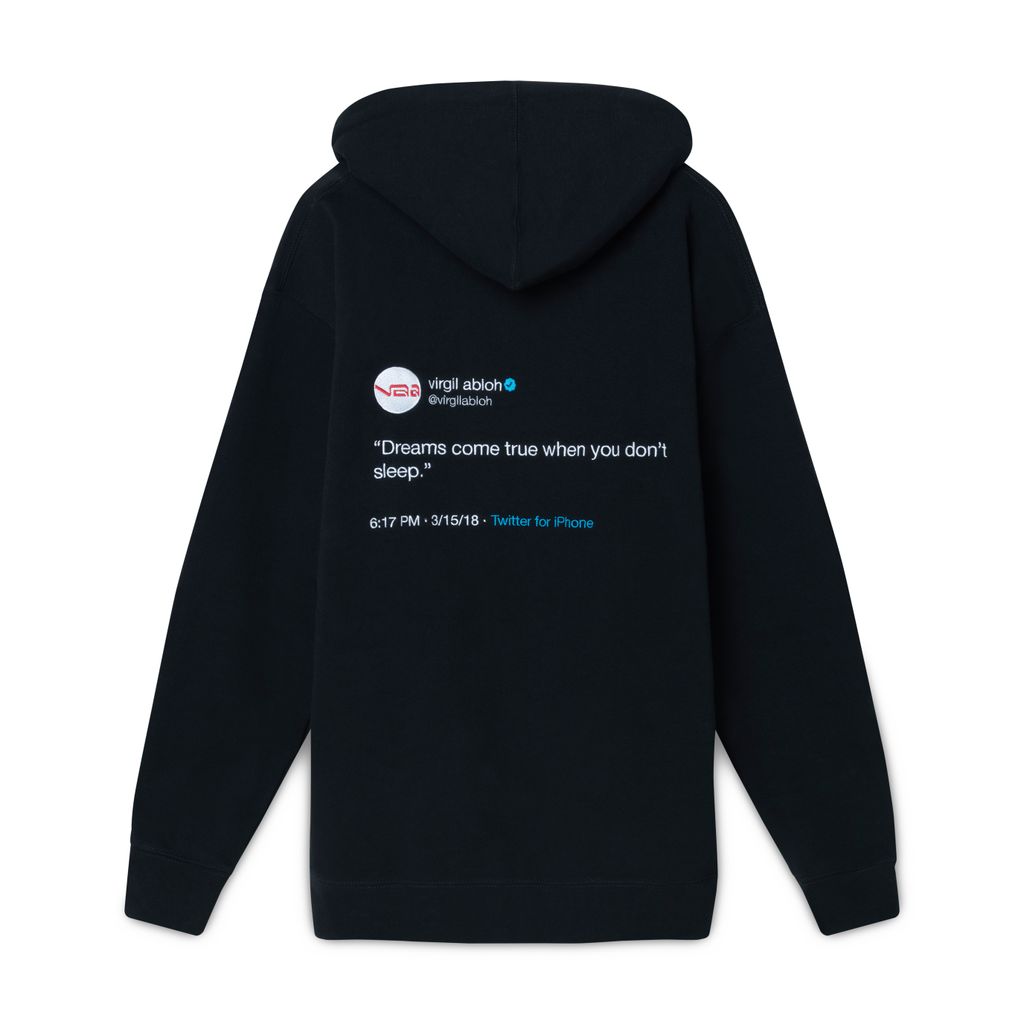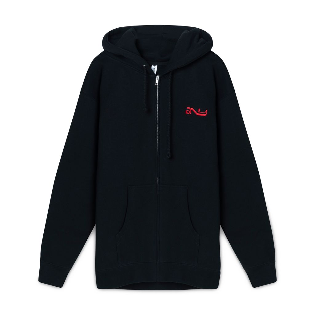 LLV Zip Hoodie in Black features hood drawstrings, embroidery on left chest, and tweet graphic embroidered on back.