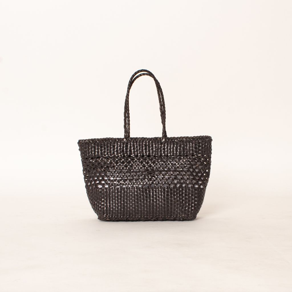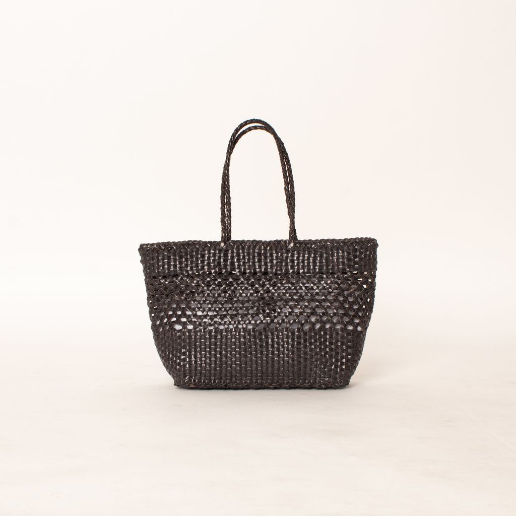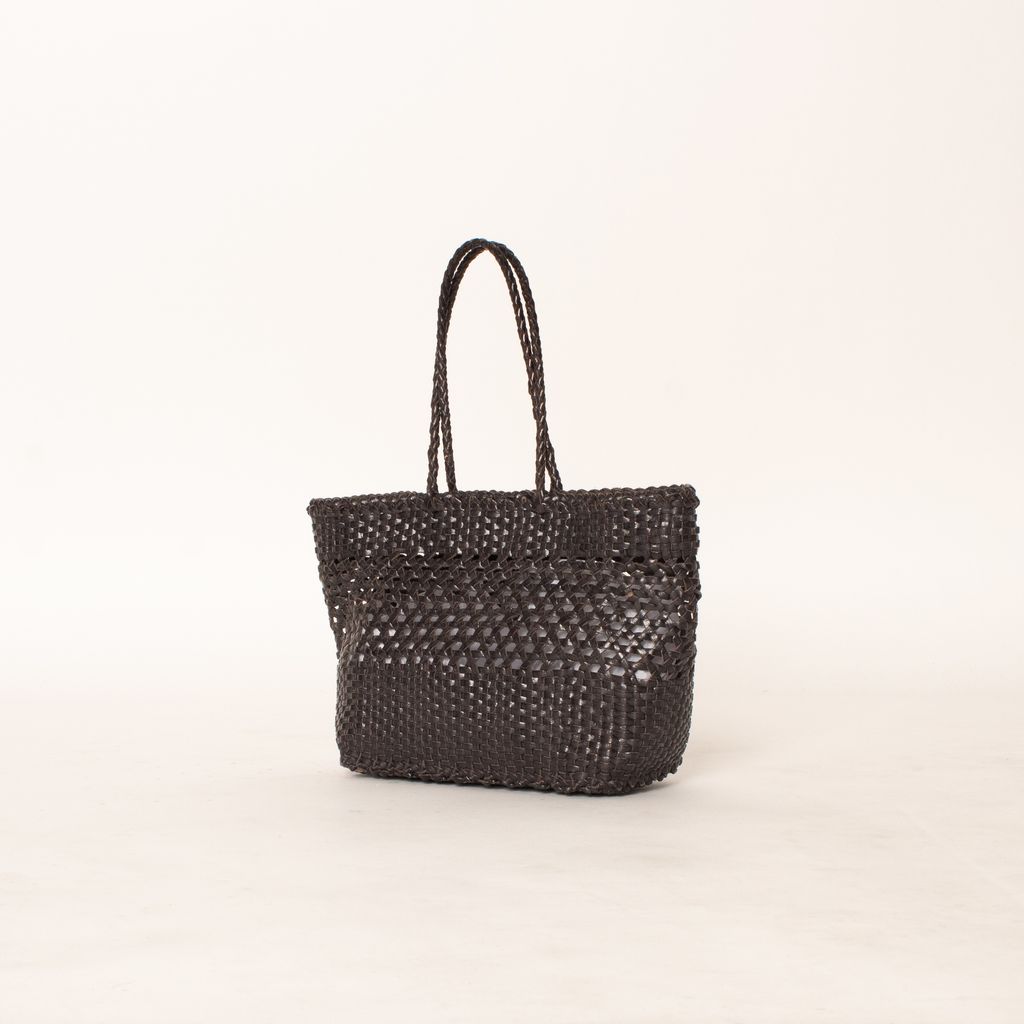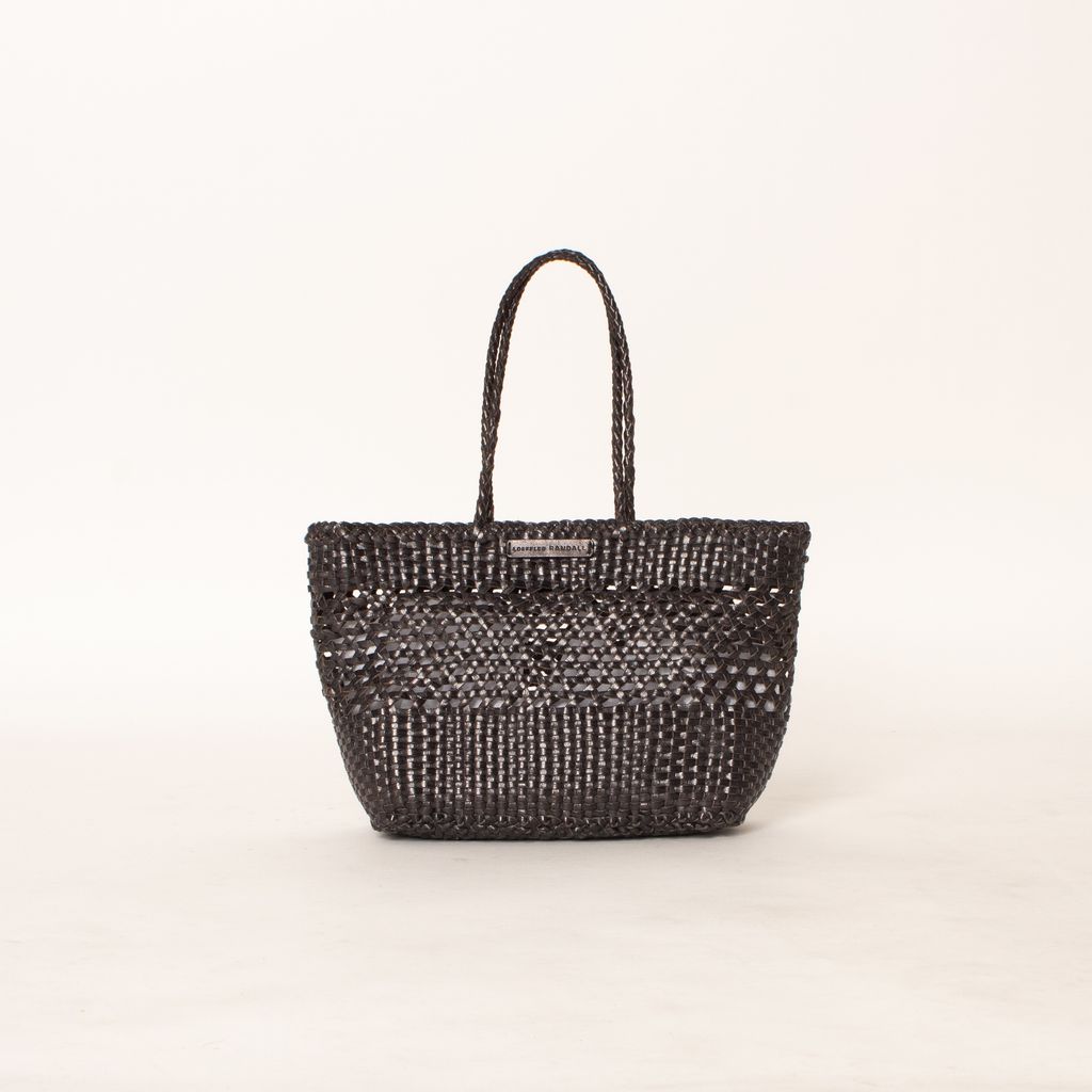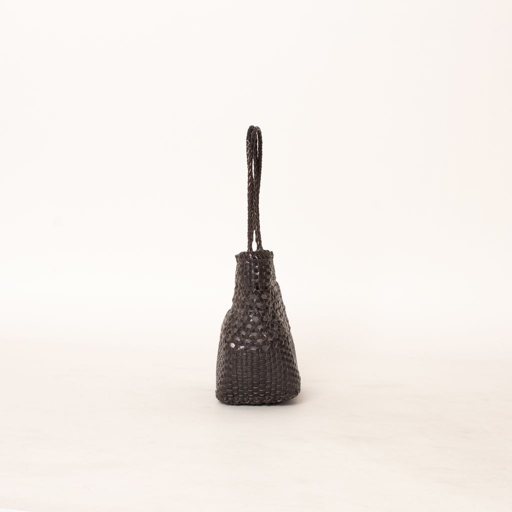 Edith woven leather mini tote in black leather with fabric bow. L 11.5in x H 6.5in x D 4in.