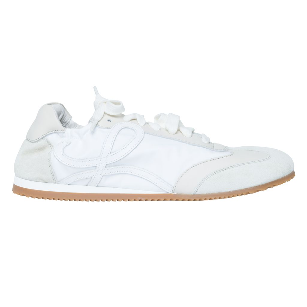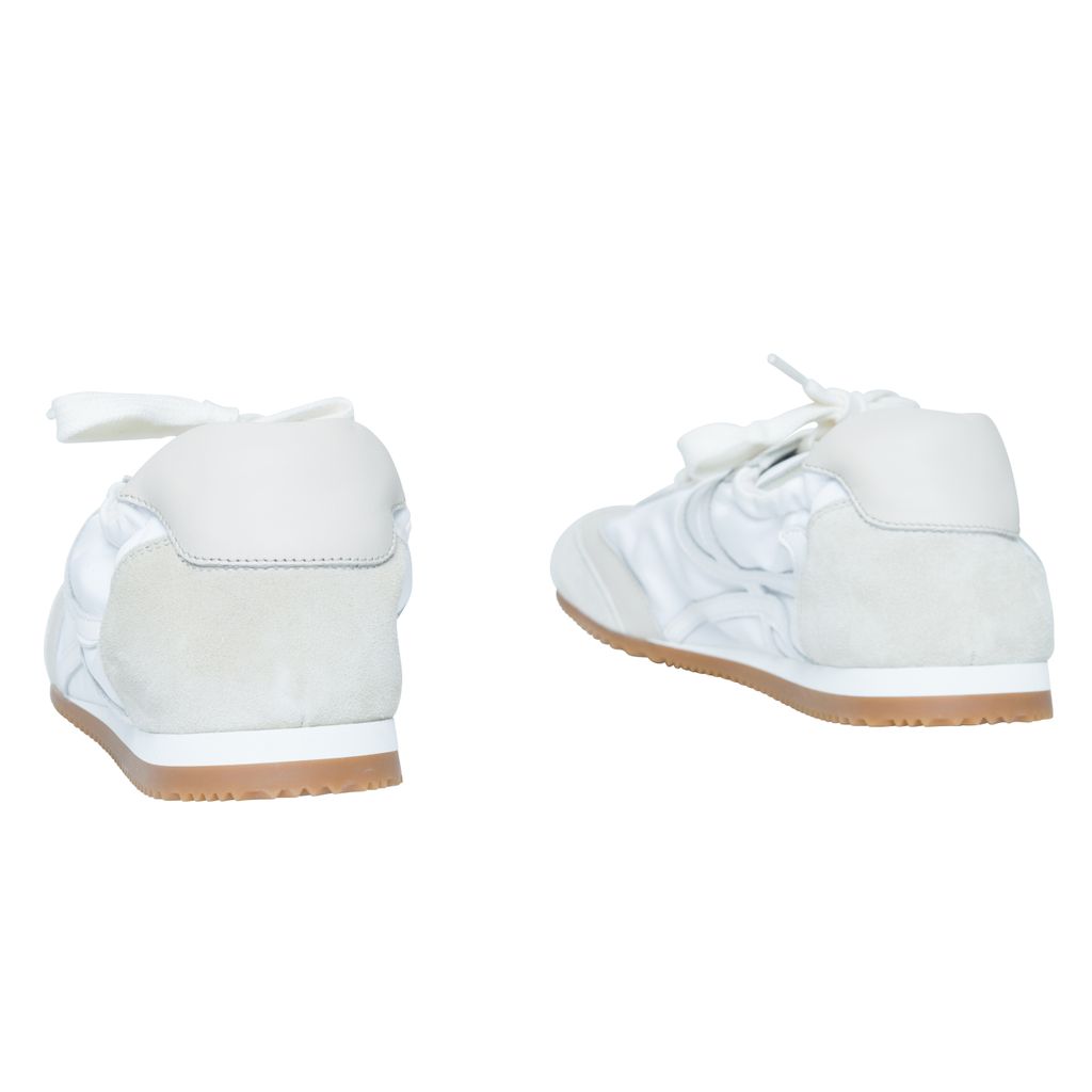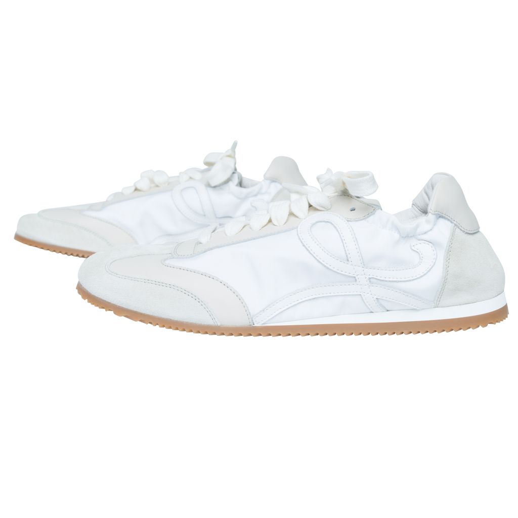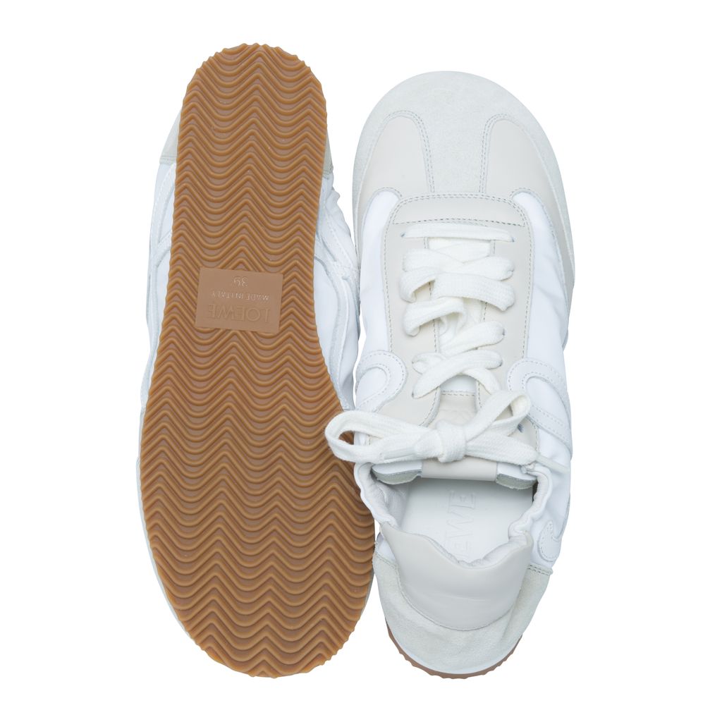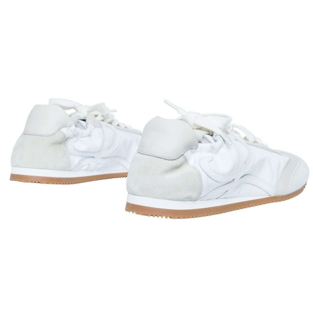 Loewe Off-White Ballet Runner Sneakers features low-top paneled technical satin, suede, and grained calfskin sneaker, round toe, and partially elasticized heel collar.