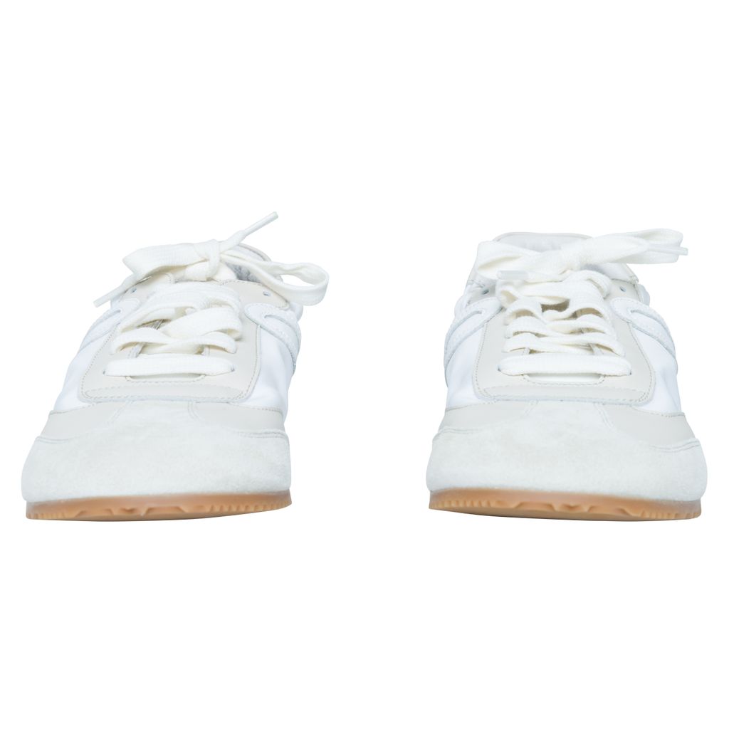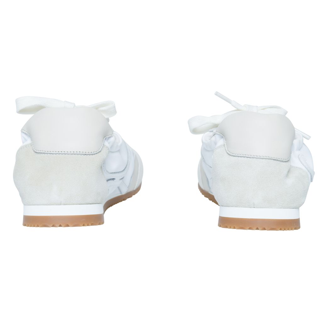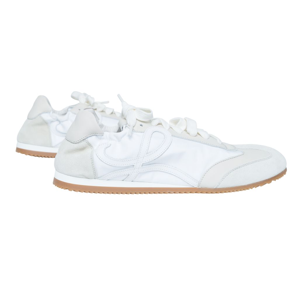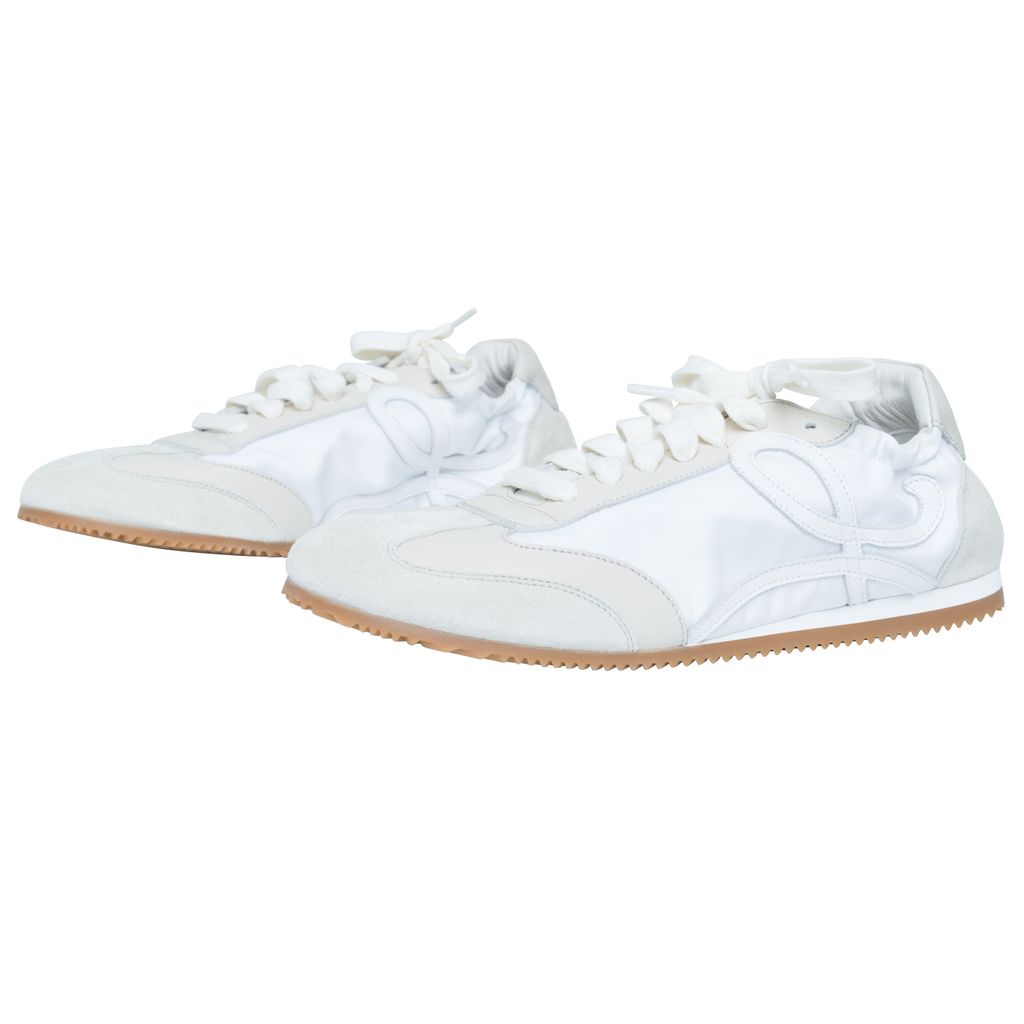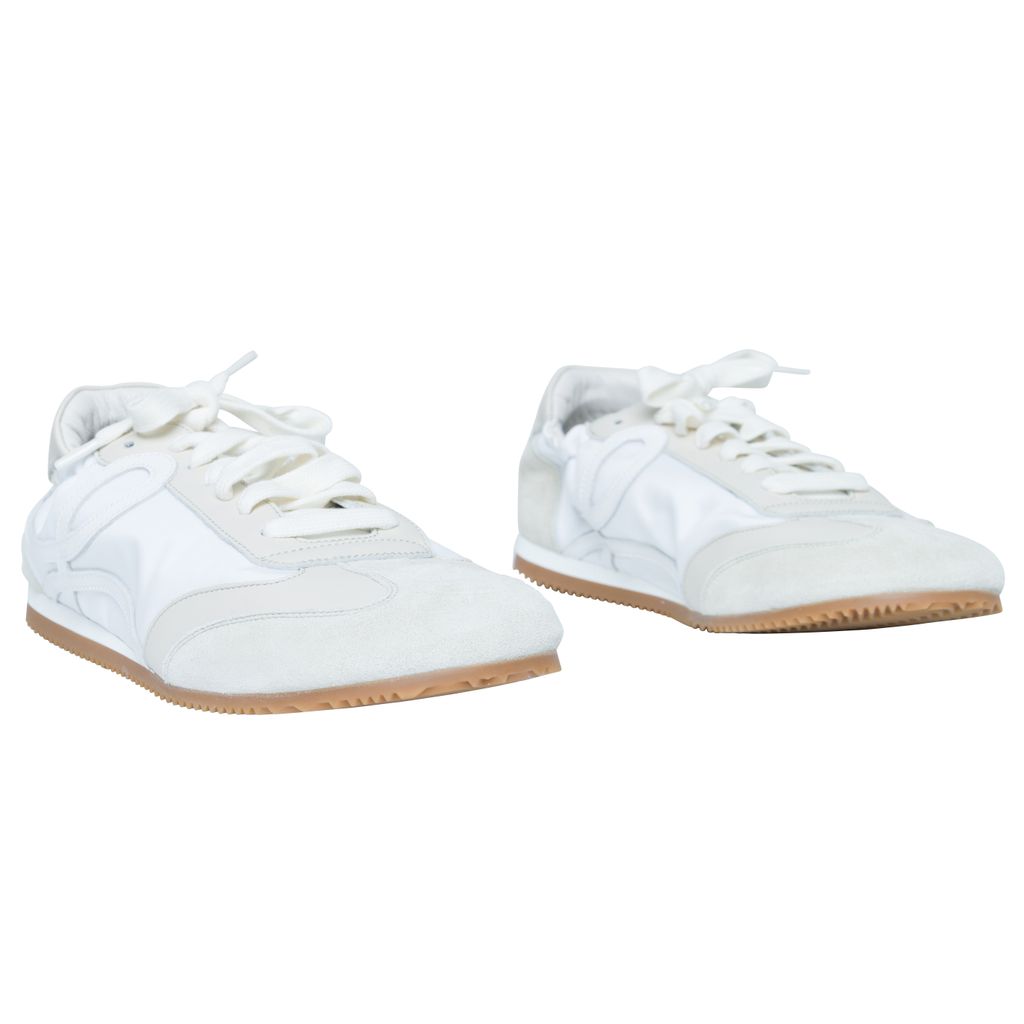 Loewe Off-White Ballet Runner Sneakers features low-top paneled technical satin, suede, and grained calfskin sneaker, round toe, and partially elasticized heel collar.