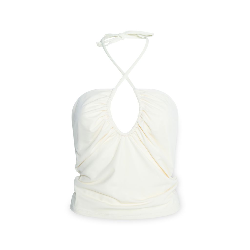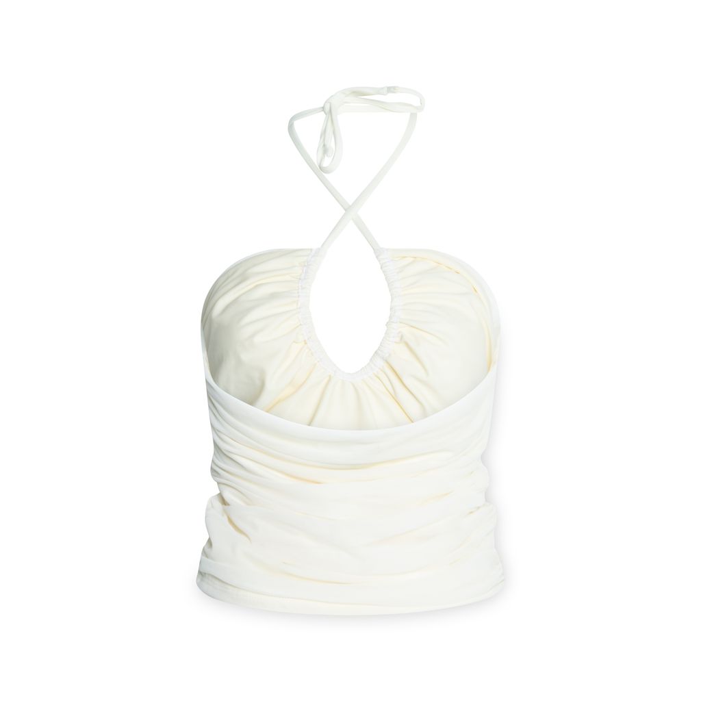 Lolo Top II features double layered tank, spandex and power mesh material, halter neck with tie fastening, and ruched back. Made in Los Angeles.