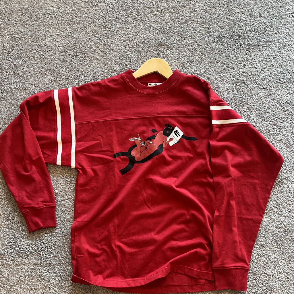 Long Sleeve features graphic on front and white stripe detailing on sleeves.