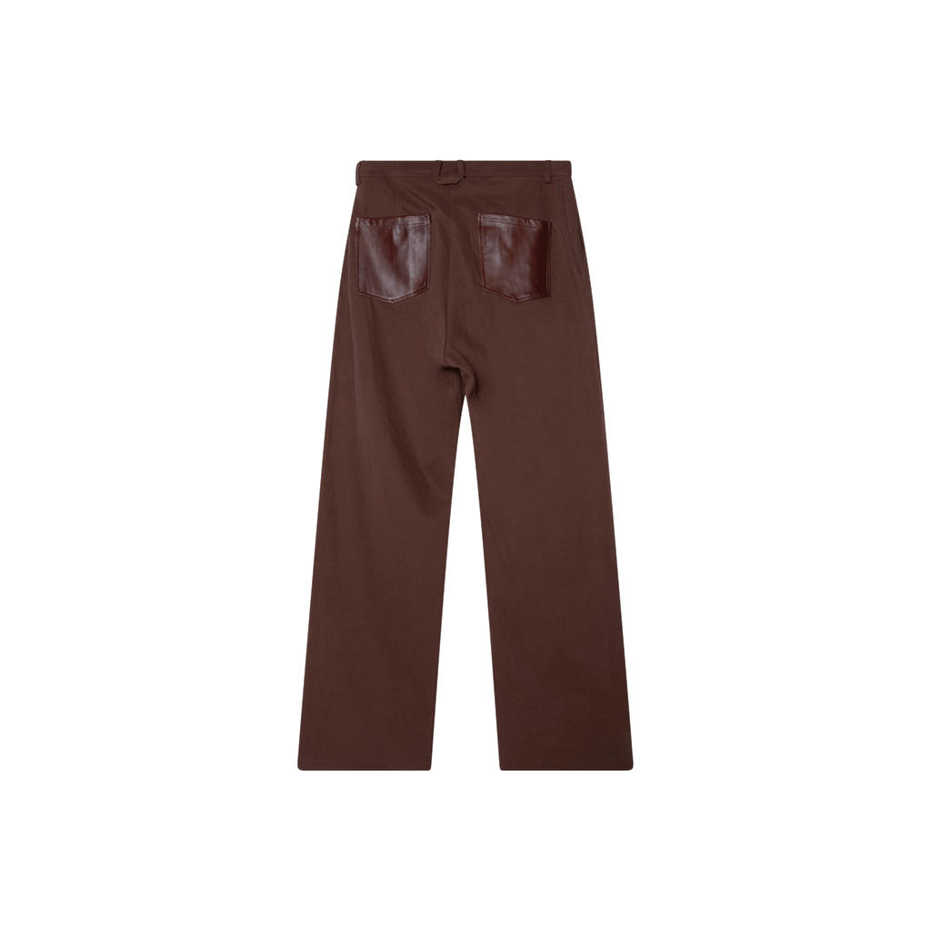 Loose Fit Pant in Brown features 2 pocket styling at front, leather patch style pockets at back, zip fly and hook at waistband, and wide leg.