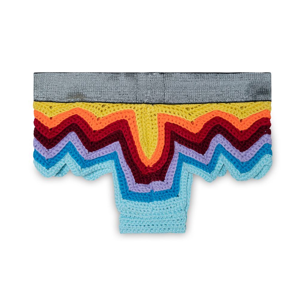 Lord von Schmitt crochet rainbow shorts swim trunks features hand crocheted underwear that you can wear in the water, based on a design created from recycled afghan blankets.