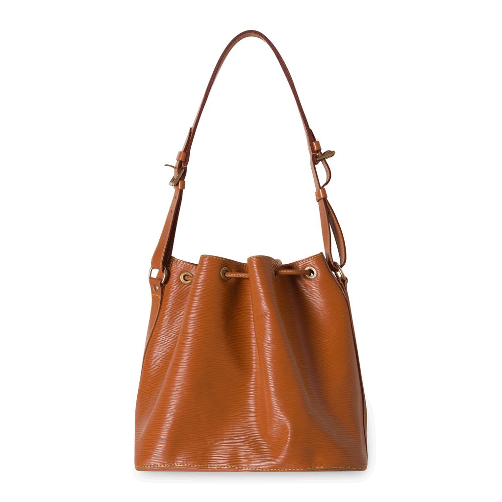 This stylish shoulder bag is crafted of epi leather in brown. The bucket shape is simple and features an easy to use green drawstring cinch cord with brass hardware and a shoulder strap of cowhide leather. The interior is a brown suede leather.