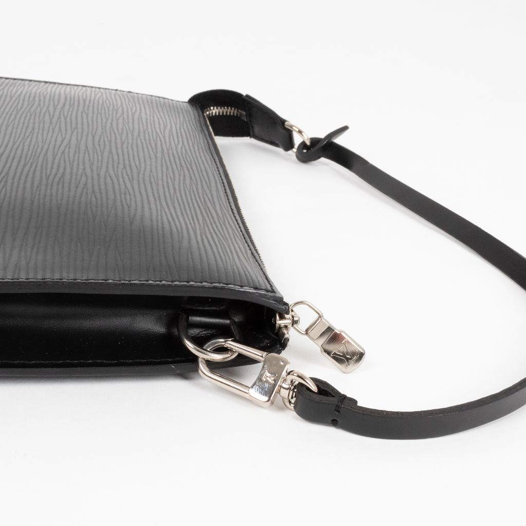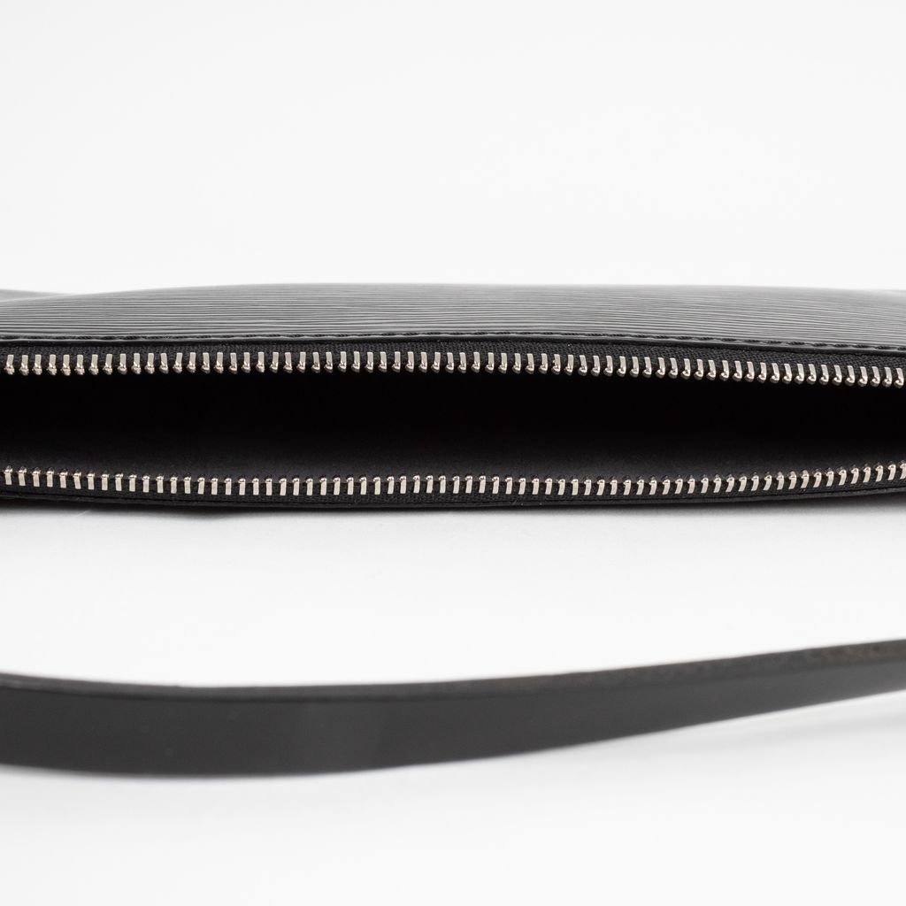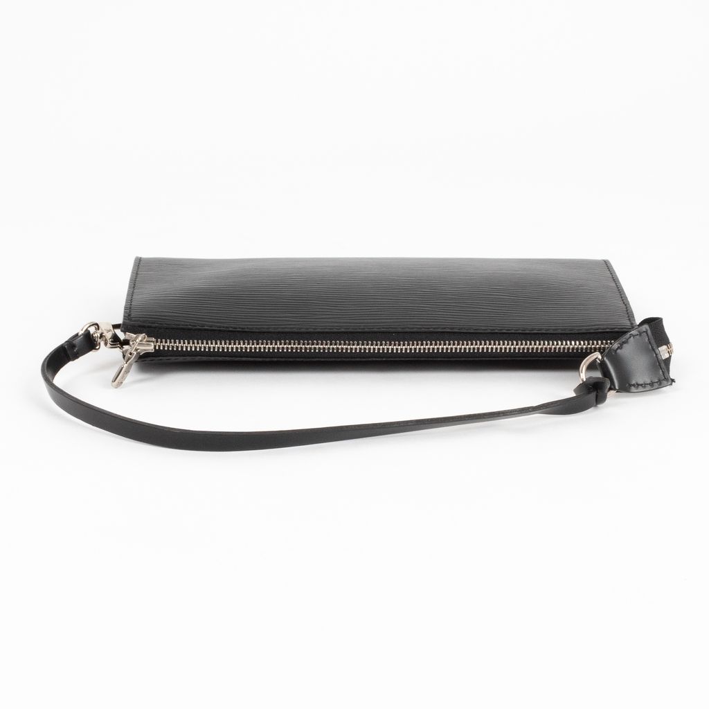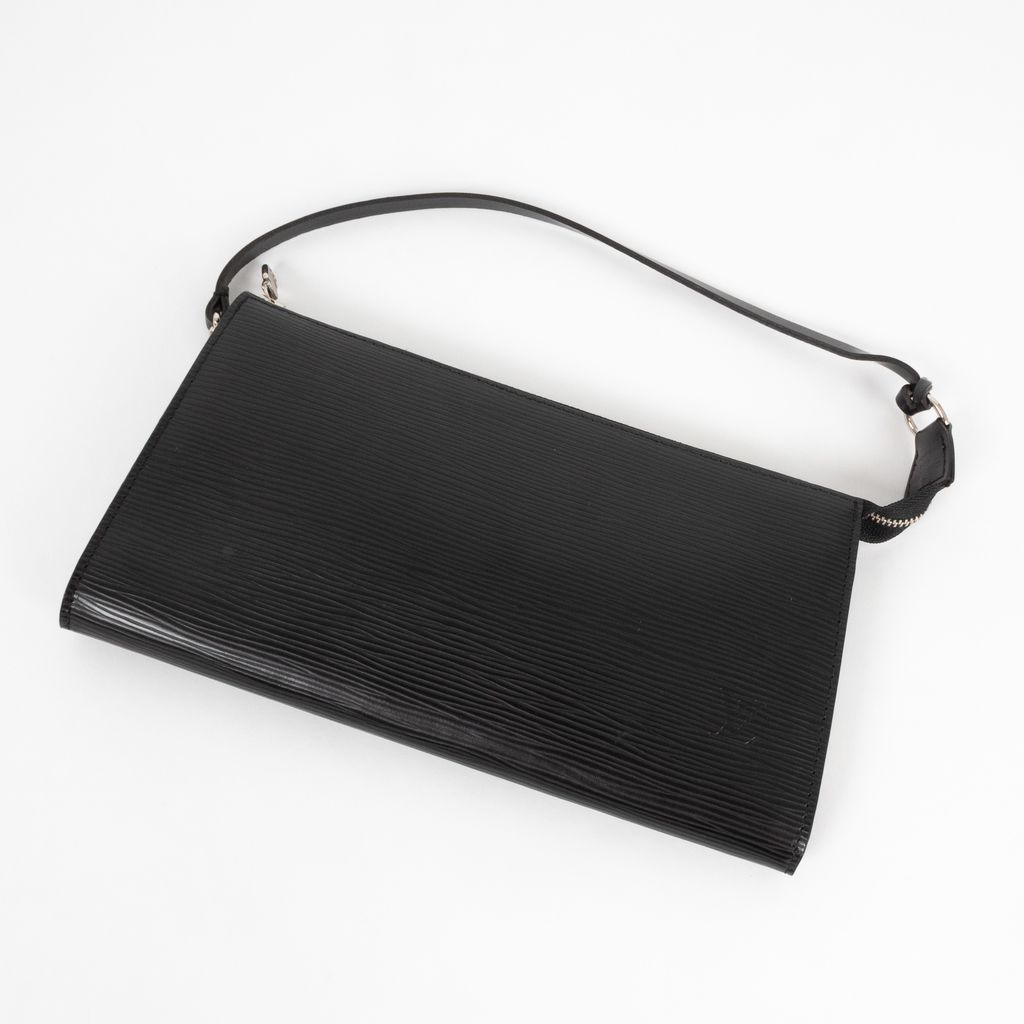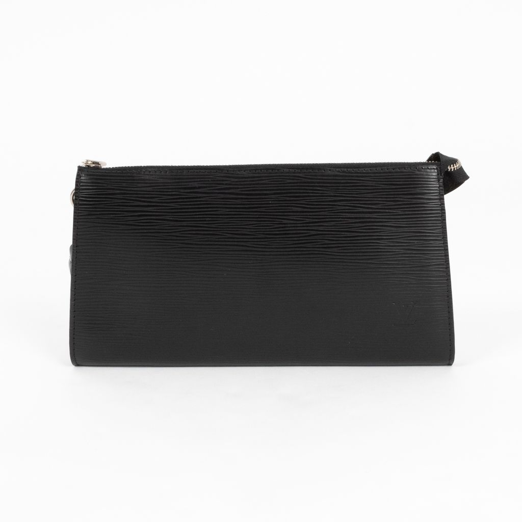 The perfect mini bag for the gal on the go, this pocket style clutch from Louis Vuitton has the carrying capacity for all the essentials. Features grooved leather body with LV embossed monogram on front, zipper top closure with LV engraved pull tab, microsuede lining, and short top handle for carrying.