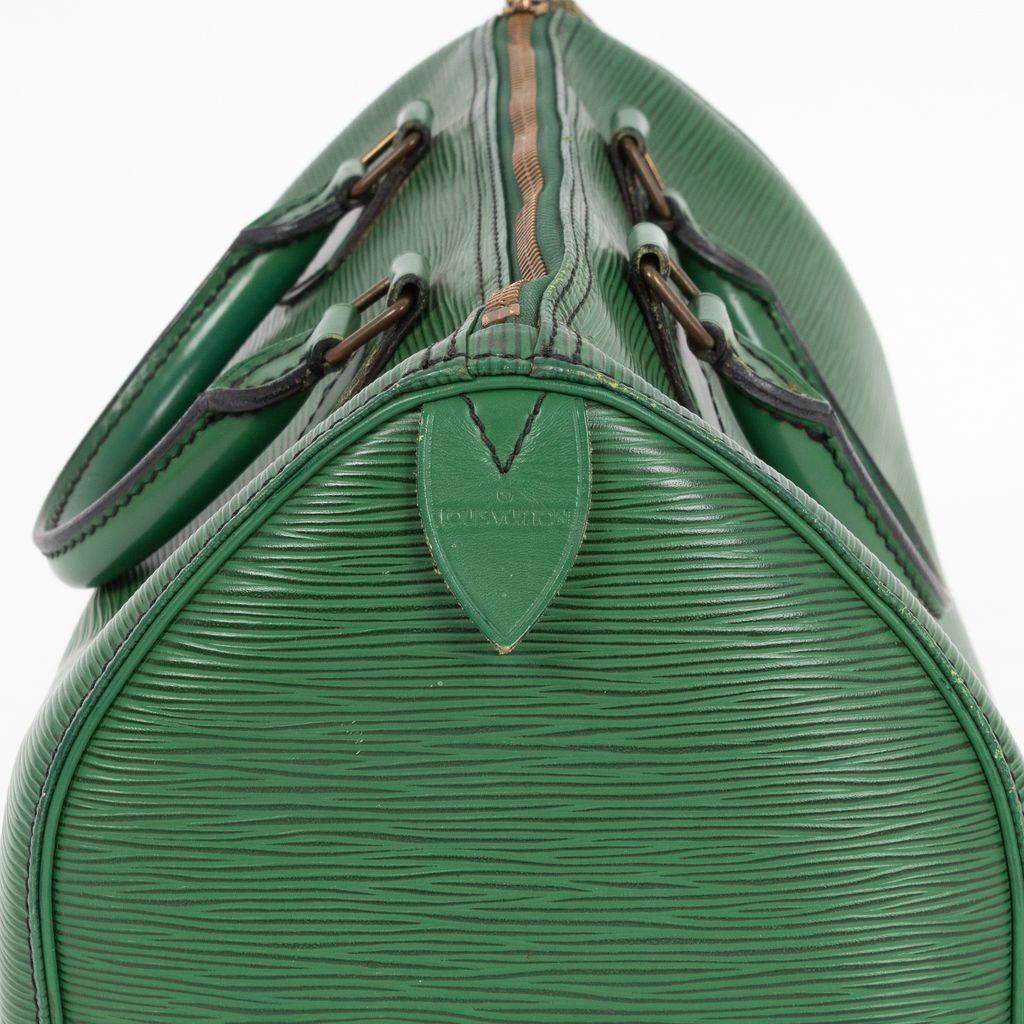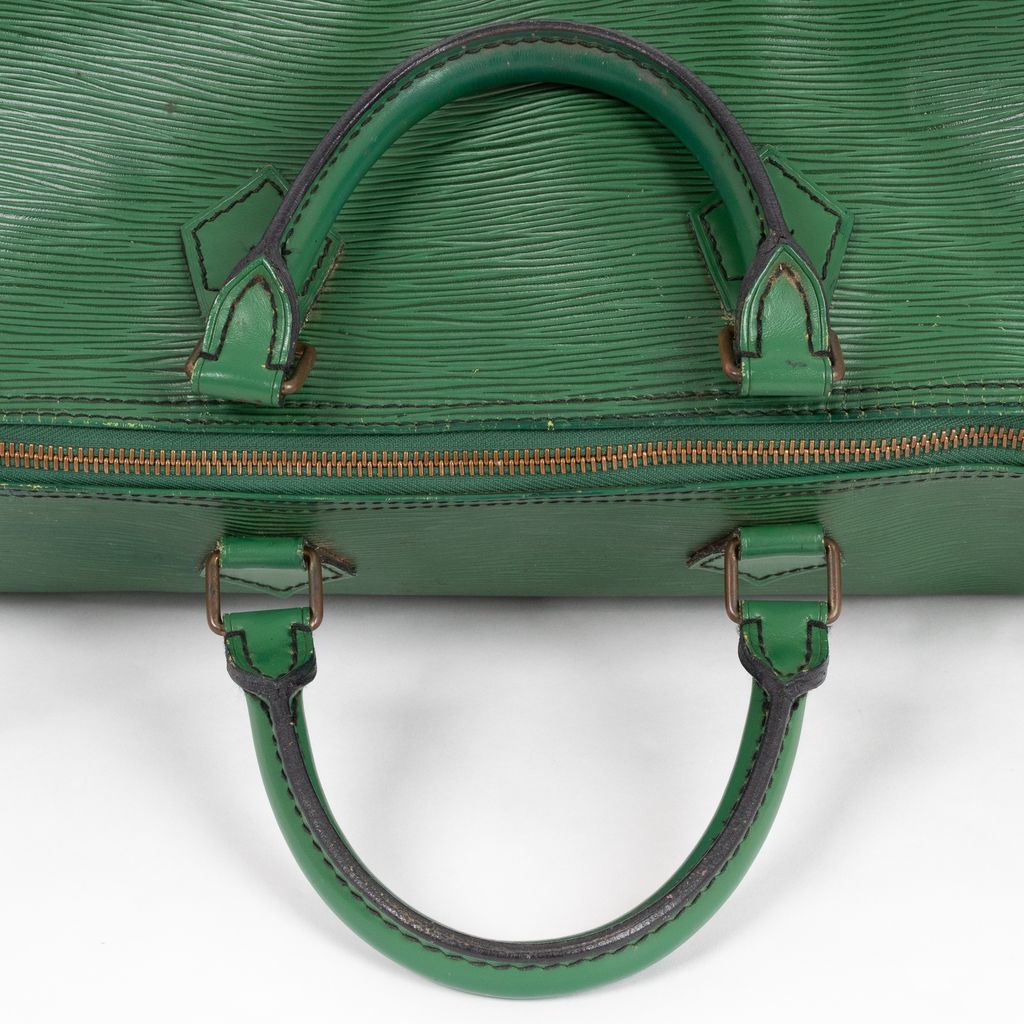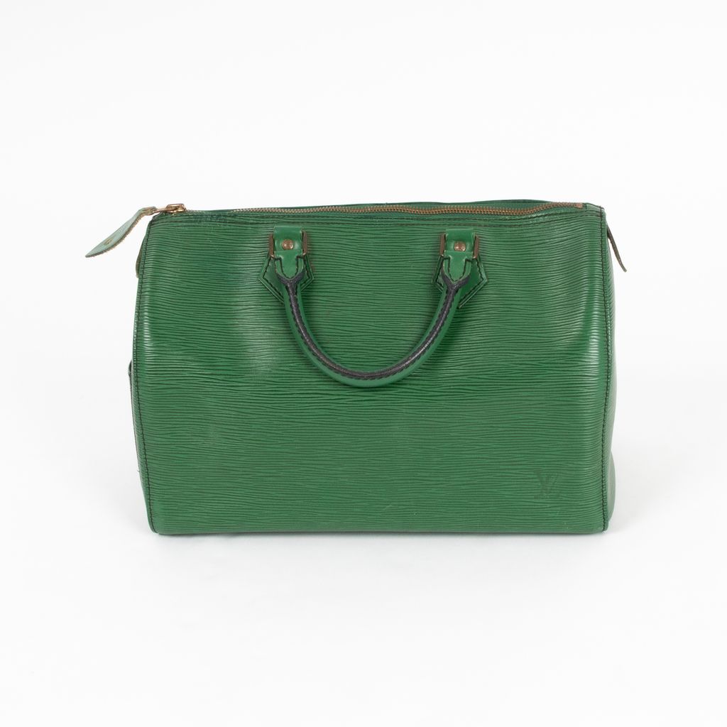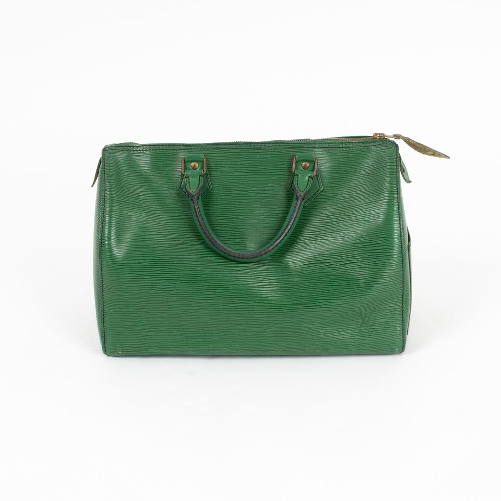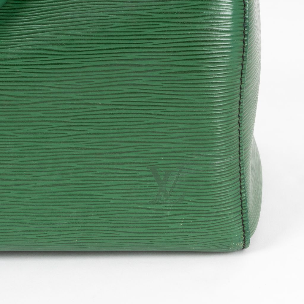 This mini duffle style purse from Louis Vuitton is a fun carryall for any season. Features grooved leather body with LV embossed monogram on front, zip top closure with leather pull tab, single side pocket, set of top handles for carrying, and small inner pocket.