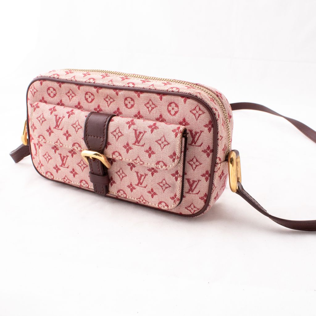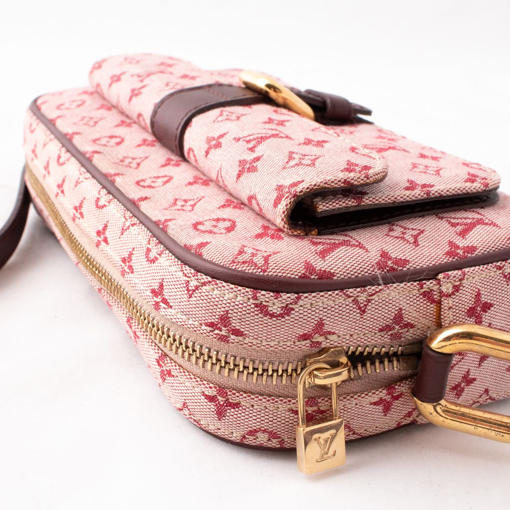 Like new, mini monogram Juliette cerise bag from Louis Vuitton. Features a small pocket with flap and belt closure in front. Top secured with double zipper. Inside has one open pocket. Carried on shoulder or across body with adjustable strap.