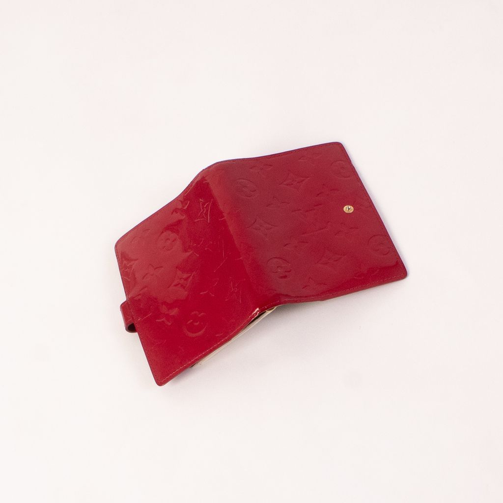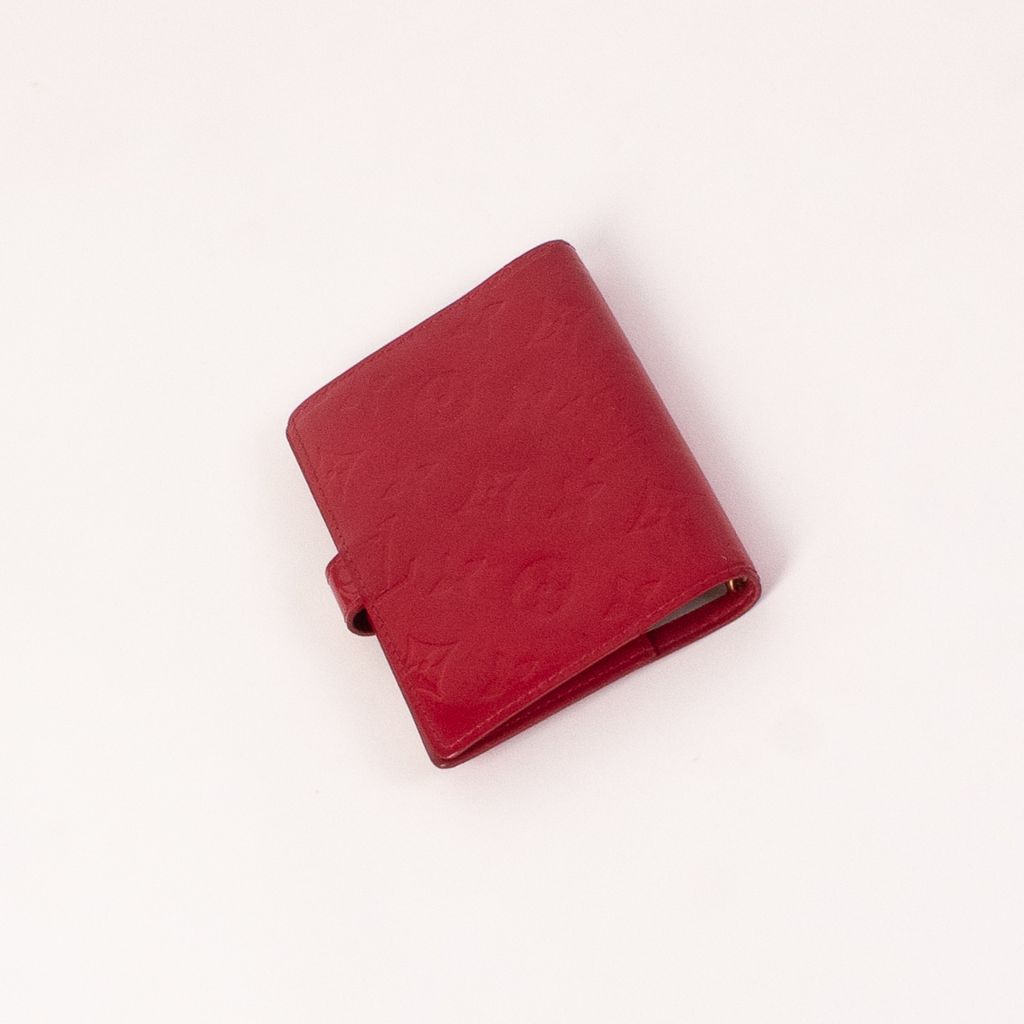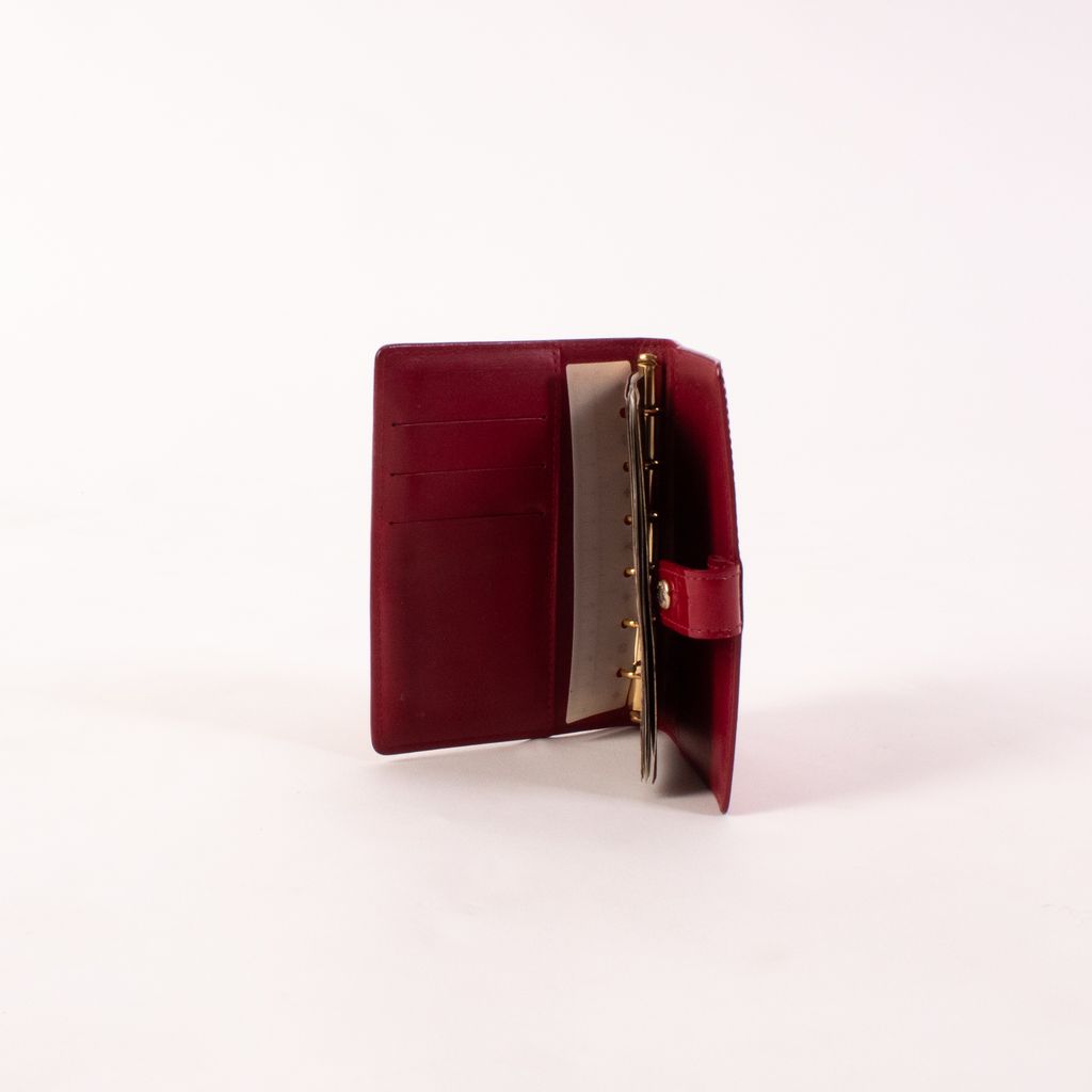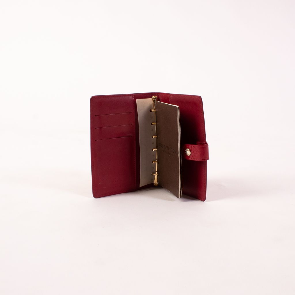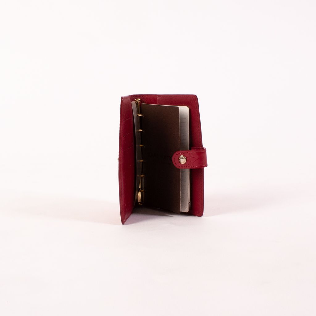 This Louis Vuitton pocket book is monogrammed to perfection all over and done in a gorgeous deep red. Features trademarked Louis Vuitton print all over, snap front closure, inner card slots, and ring bound date book.