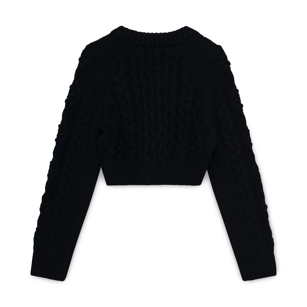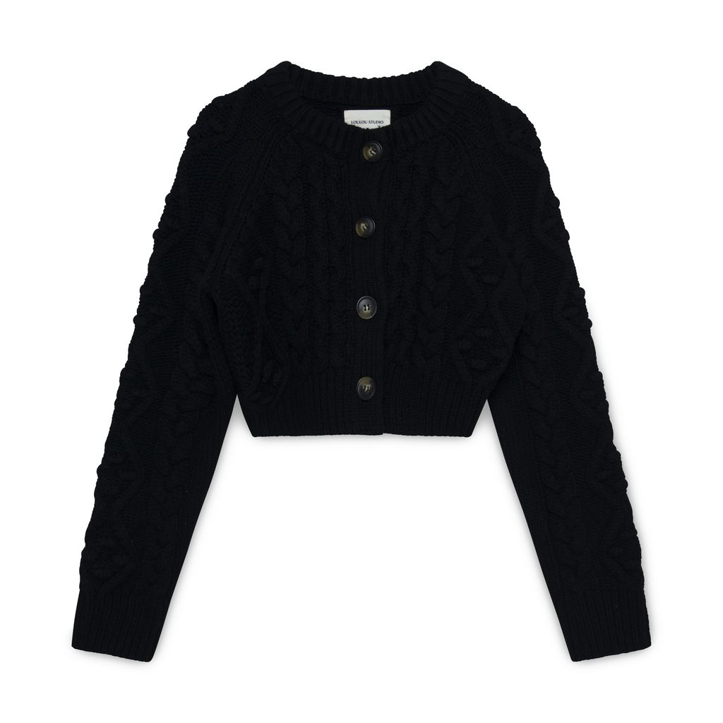 Loulous Studio Black Abaco Cropped Cardigan features cable knit texture, ribbed knit collar, and front button closure.
