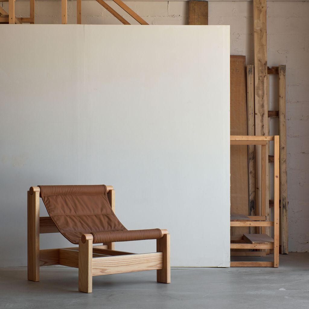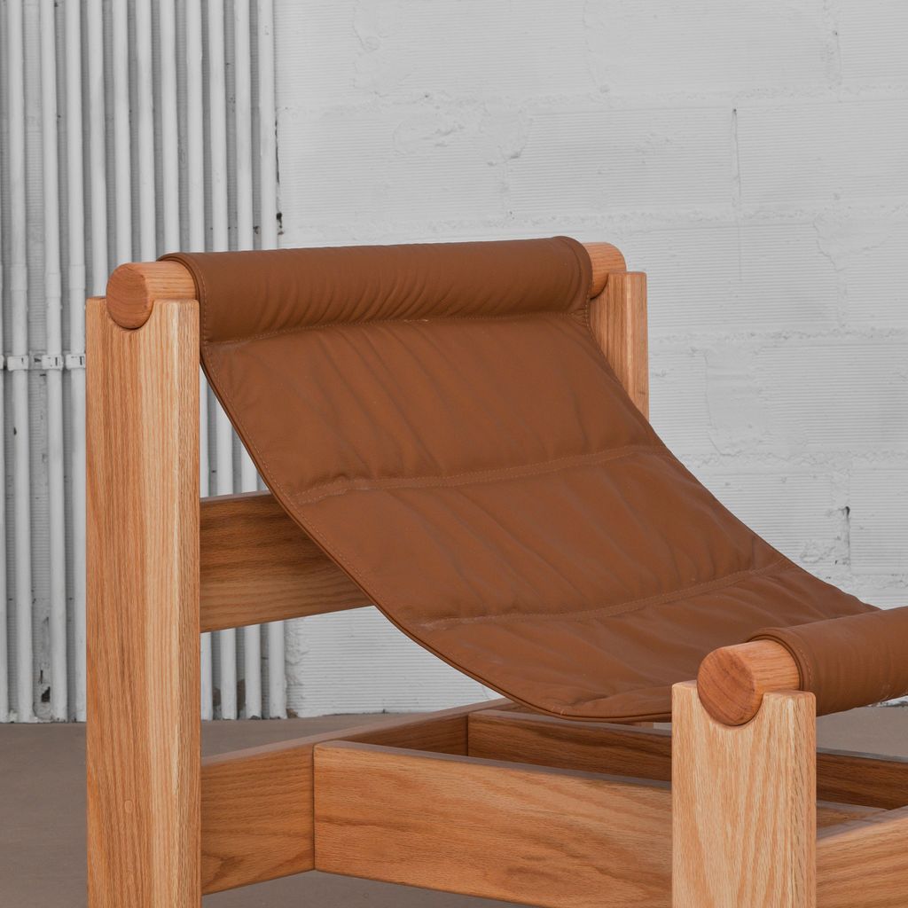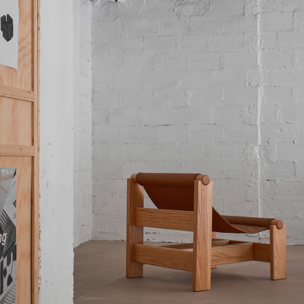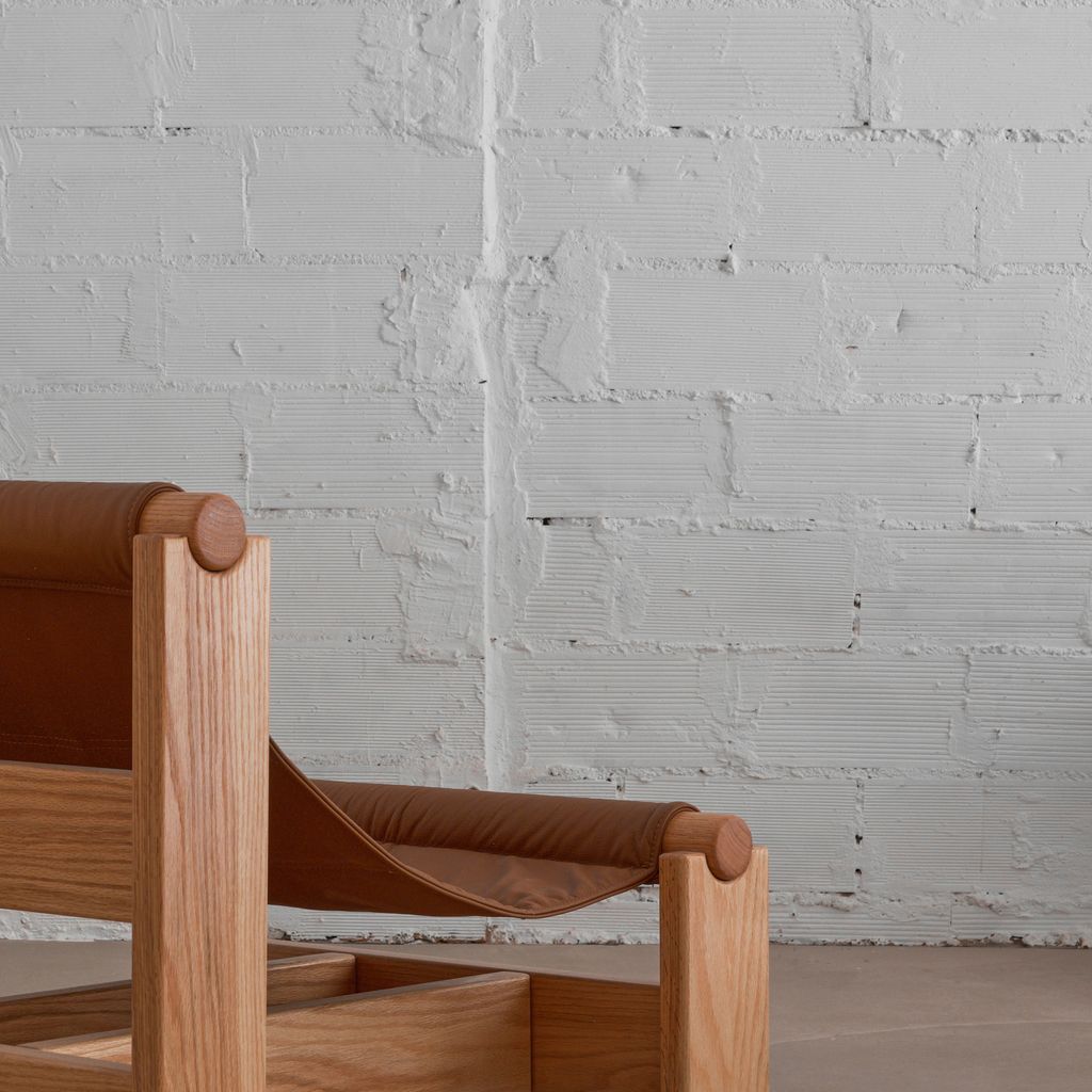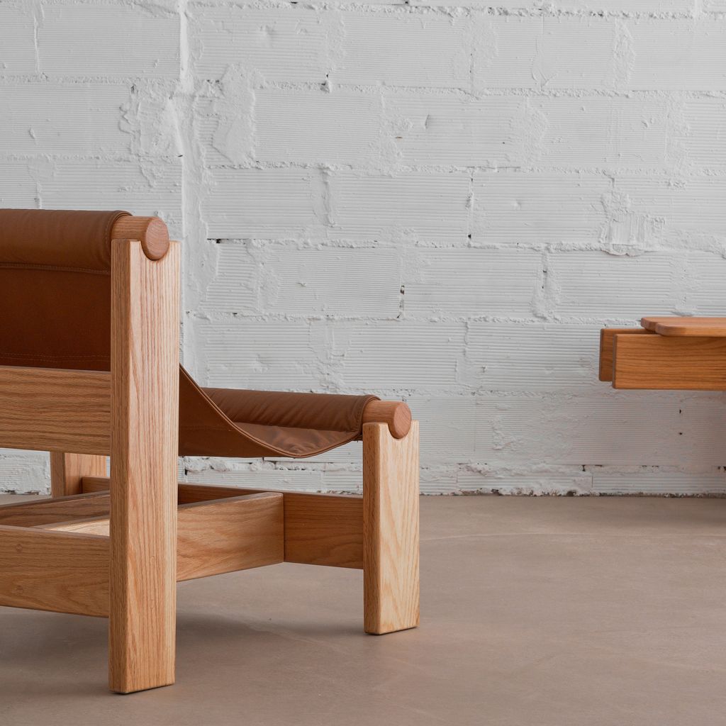 The design of this oak wood and leather lounge chair explores the relationship between the body and gravity, searching for that moment when one lets go, and instead of an action of impact, it becomes an invitation to deep rest.