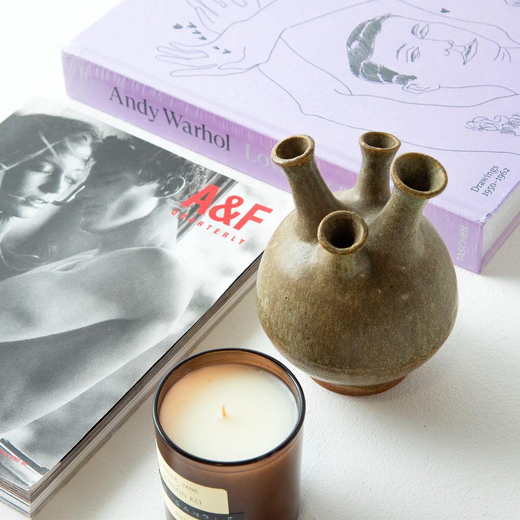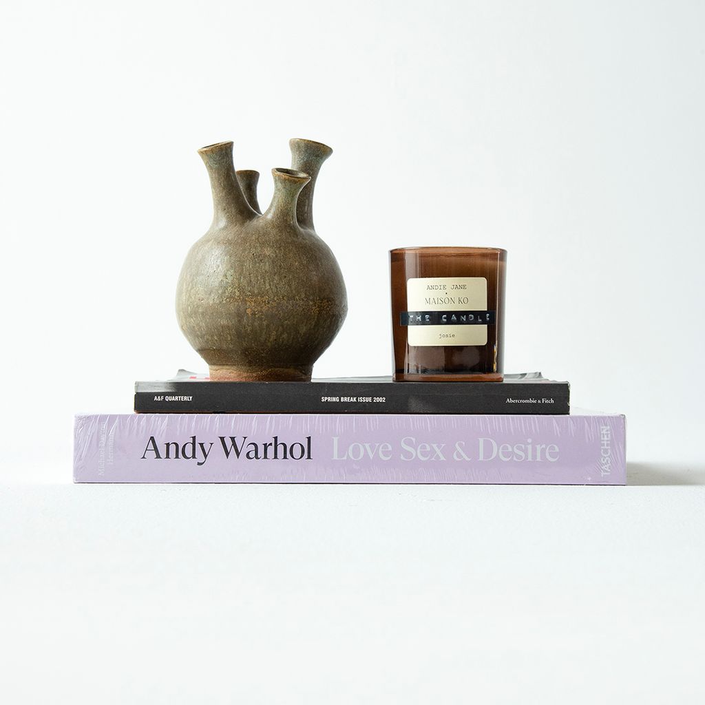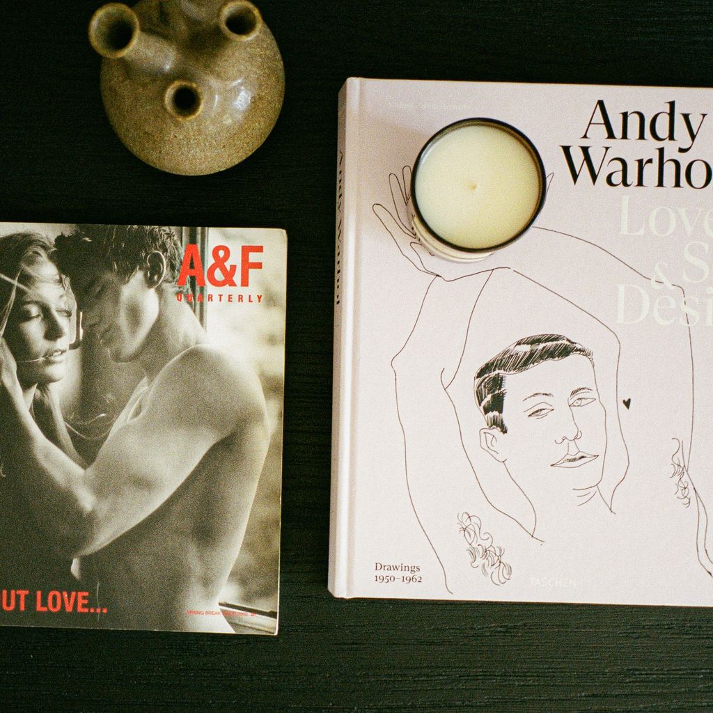 Love is Love features New 'Andy Warhol: Love, Sex & Desire: Drawings 1950-1962' Book, Vintage 'A&F Quarterly Spring Break Issue 2002' Book, Vintage Chimney Vase, and Andie Jane x Maison Ko 'josie' Candle with notes of iris. bergamot. and vanilla.