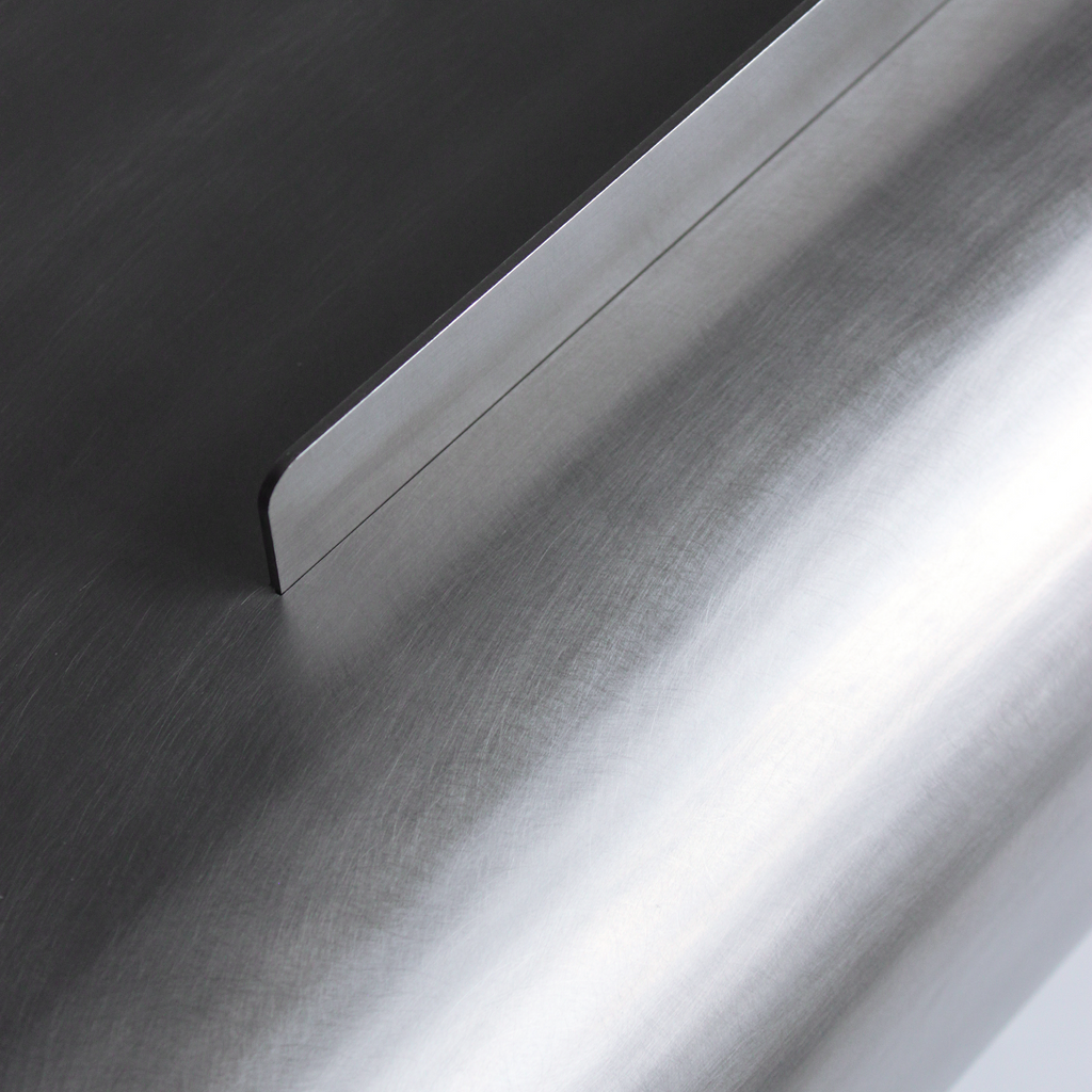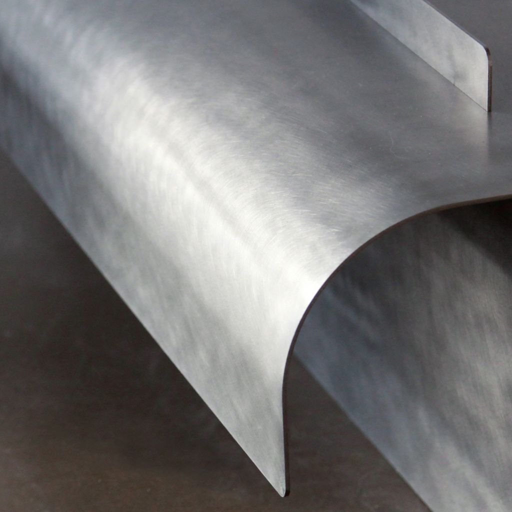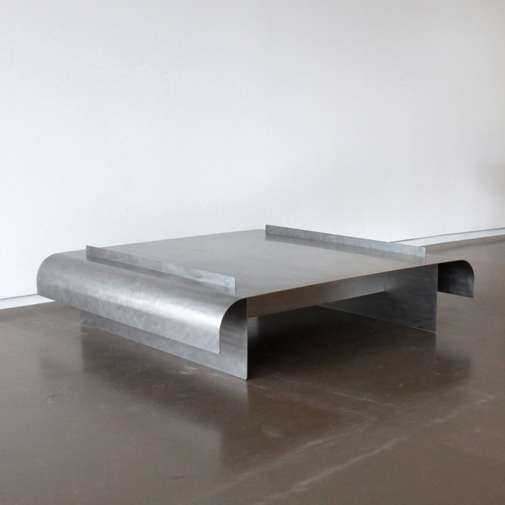Bend Low, 2018 is a stainless steel coffee table constructed without screws, welding or glue. Each plain of the table interlocks within another providing support and resulting in a form that can be easily assembled and disassembled. Curved sides of the table giving the table an approachable and friendly character. Whilst every detail is laser-cut for the perfect fit, every detail of the Bend table is later brushed by hand. The traces left on the surface show the human touch in its cloudy texture and let the surface play with the light and reflect its surroundings
