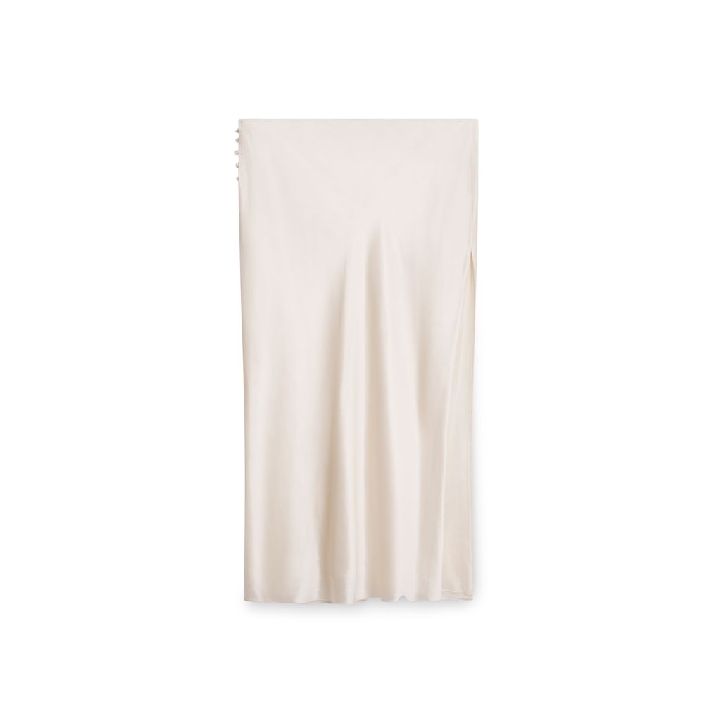 Low Rise Bias Skirt in Pearl features a low rise cut on the bias, made of 100% silk.