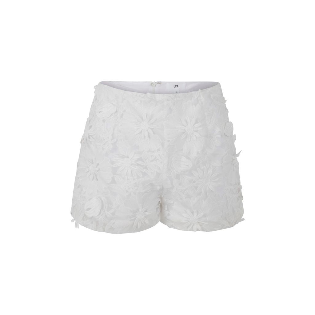 Featuring white embroidered fabric with 3D floral appliqués, these shorts from LPA are perfect for warm sunny days.