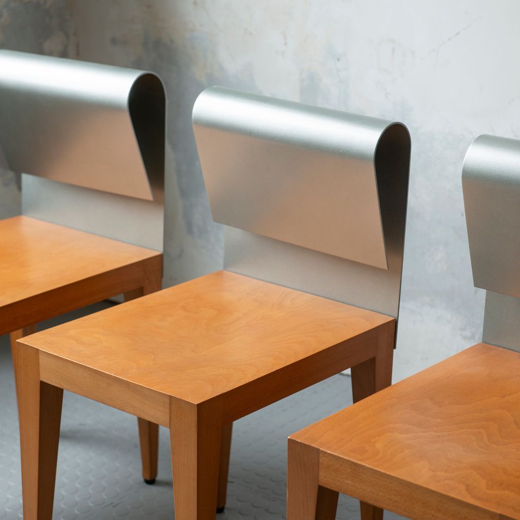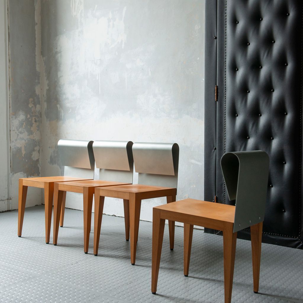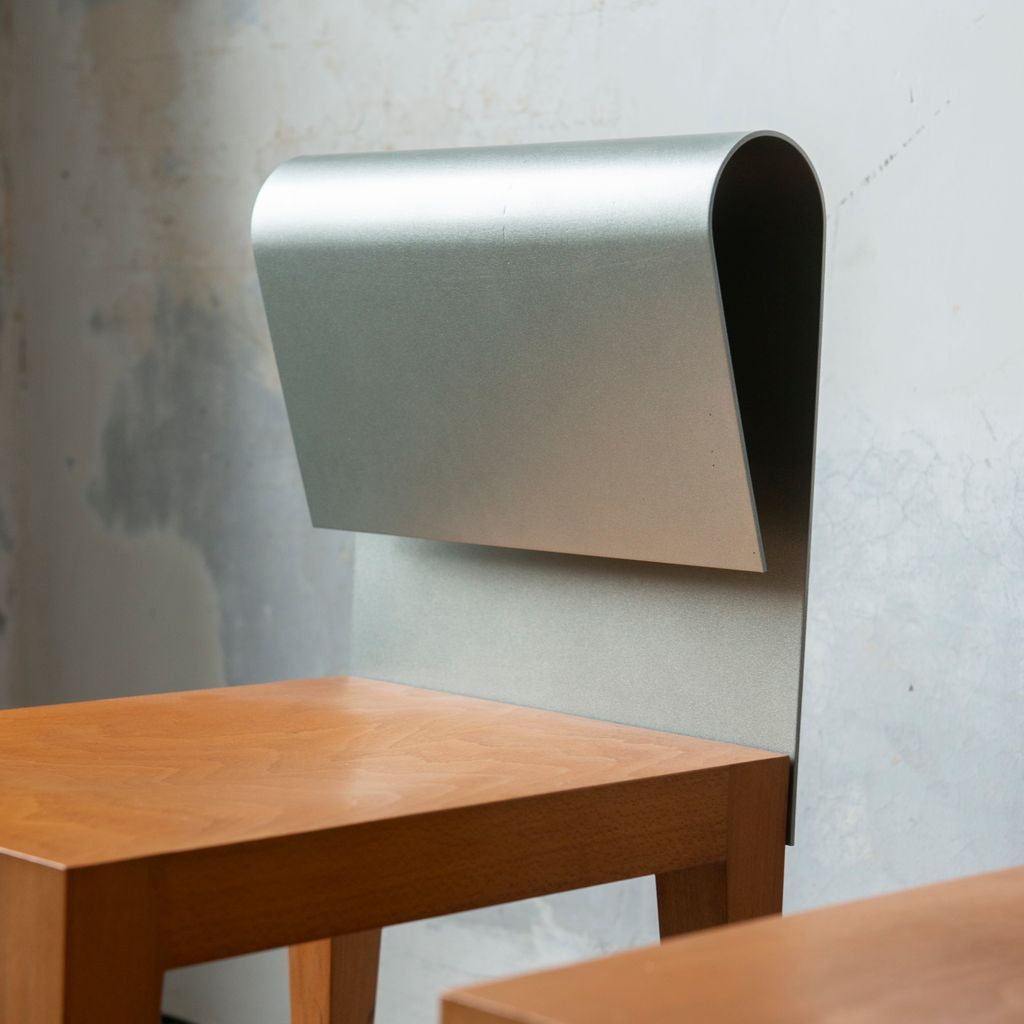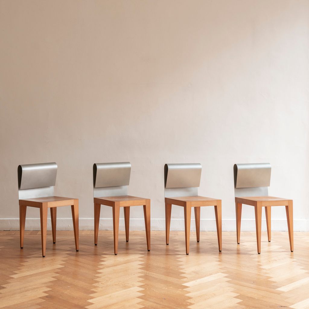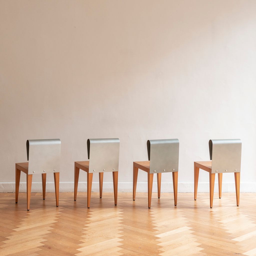 This set of 4 extremely rare chairs - a production of only 10 prototypes - consist of a folded & oven powder coated aluminium backrest connected to an oiled beech base that is slightly inclined & curved for seating comfort.