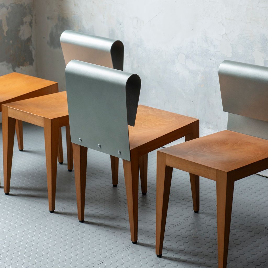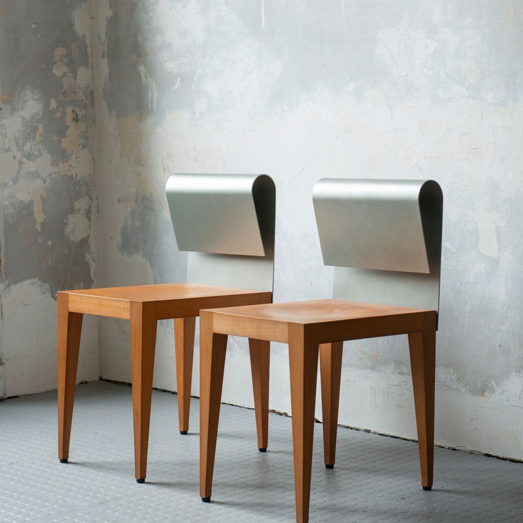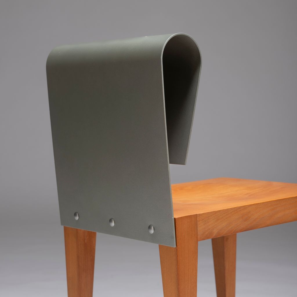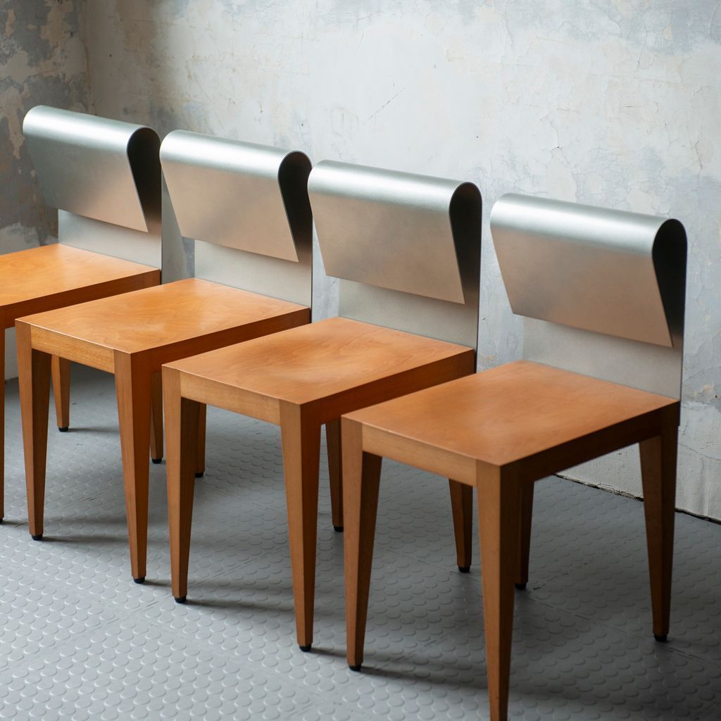 This set of 4 extremely rare chairs - a production of only 10 prototypes - consist of a folded & oven powder coated aluminium backrest connected to an oiled beech base that is slightly inclined & curved for seating comfort.